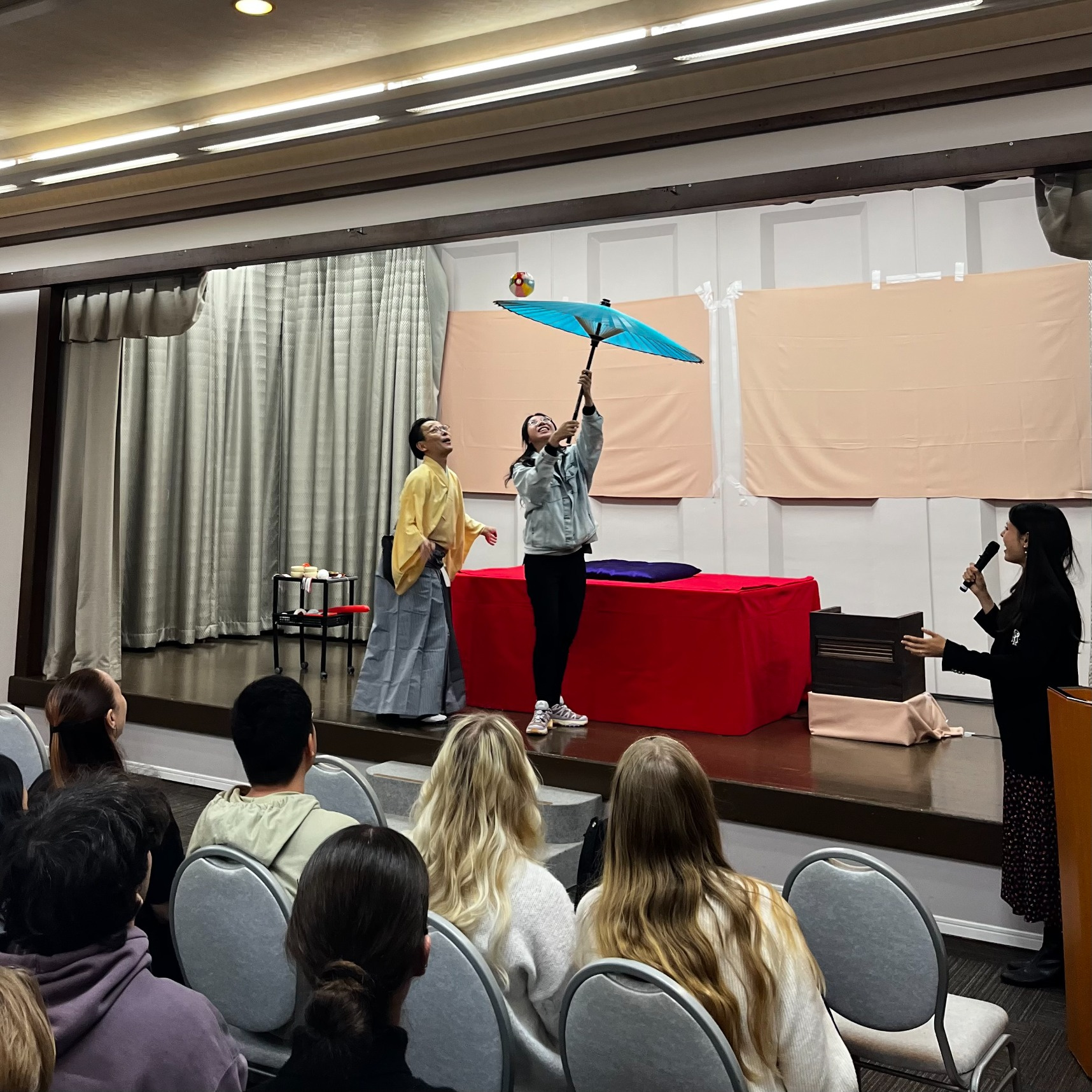 その後、バスで天橋立に移動し、天橋立ホテルにて太神楽曲芸と落語を鑑賞しました。熟練の技が決まるたびに大きな歓声が上がり、体験コーナーには多くの留学生が積極的に参加しました。落語は天橋立の伝説にまつわるものが英語字幕つきで行われ、留学生からは、「日本語に加えて英語字幕があったおかげで、芸を楽しむだけでなく伝説の内容もよく理解できた」との感想が寄せられました。