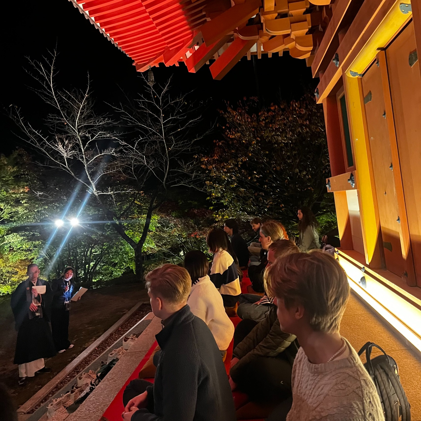 ツアーの締めくくりは成相寺での紅葉ライトアップ鑑賞と阿字観(瞑想)体験です。ライトアップされた紅葉と五重塔のコントラストはたいへん美しく、静かな瞑想の時間とあいまって心の落ち着きを感じるひとときとなりました。