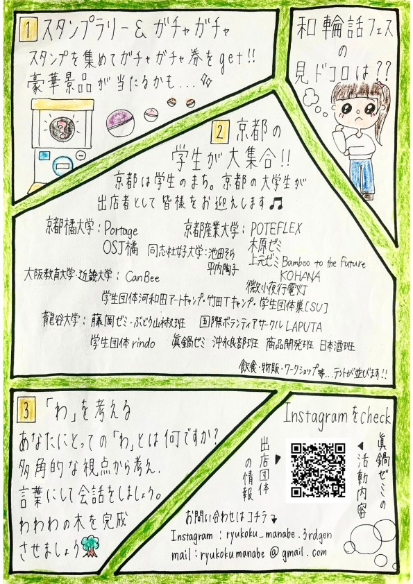 龍谷大学経営学部眞鍋ゼミでは、ゼミの学びの集大成として学内外の団体・ゼミが一堂に集結するイベント「和輪話フェス」を開催いたします。