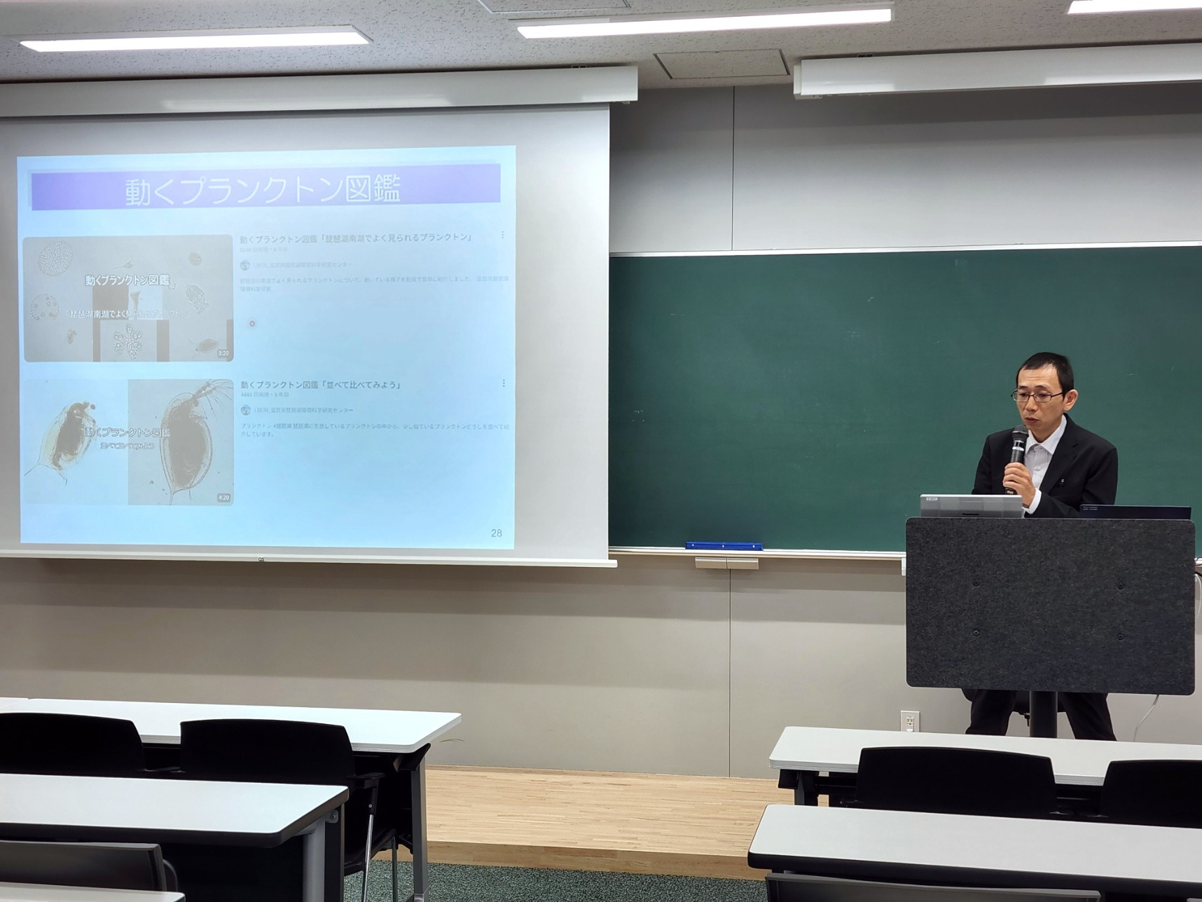 植物プランクトンは湖沼生態系で生産者として重要な役割を果たす一方、その挙動は琵琶湖の水質を決定する重要な因子の一つであり、琵琶湖の水を利用する私たちの生活にも影響を与えることがあります。滋賀県では、琵琶湖で植物プランクトンの調査を長年実施しており、調査の中で確認された様々な植物プランクトンを紹介するとともに、調査結果の解析から分かってきたことについて説明しました。