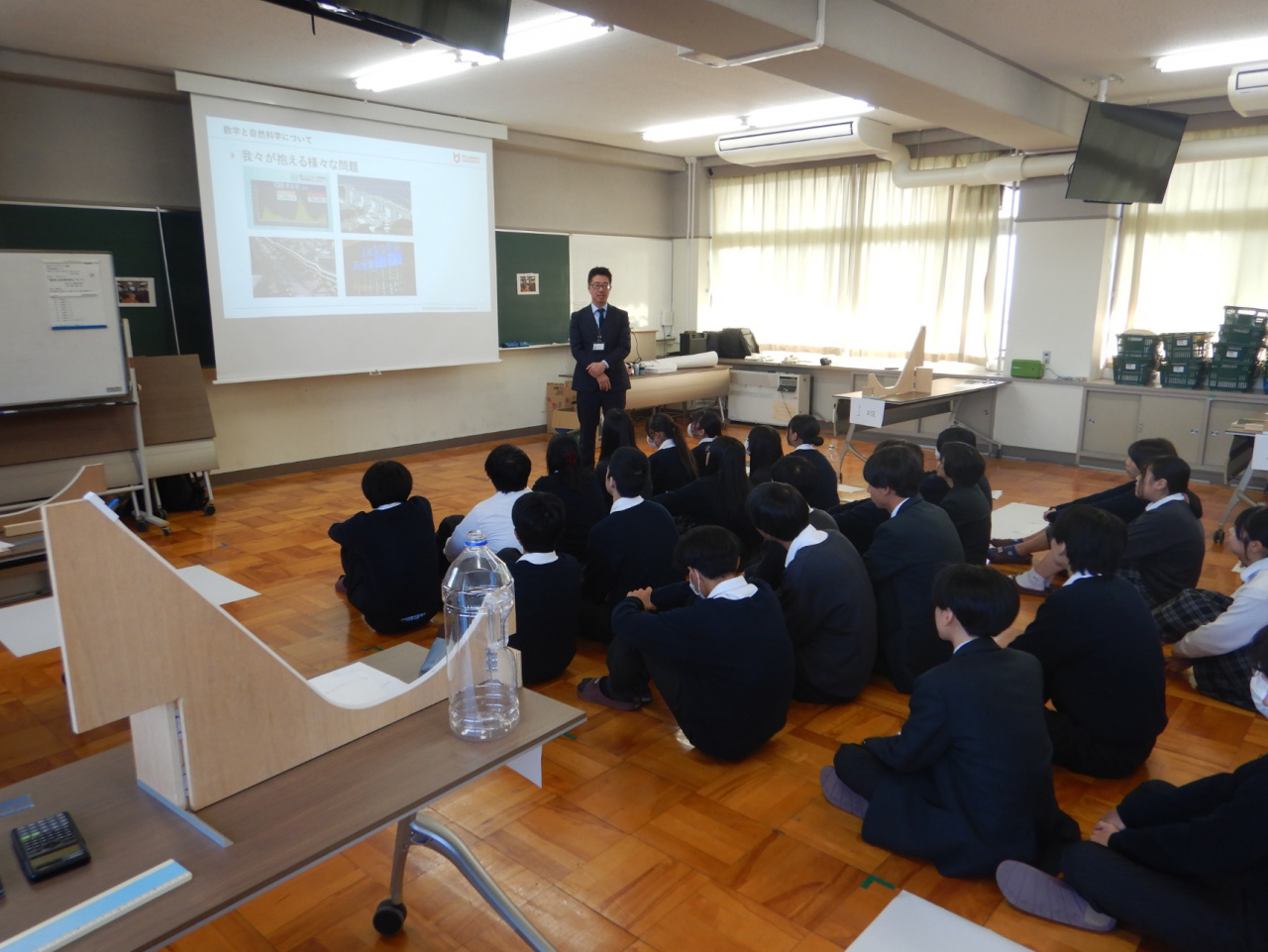 2025年10月29日(水)に数理・情報科学課程の深尾武史教授が京都府立洛西高等学校にて、サイエンスチャレンジ講座「数学と自然科学について」という題目で2年生(2クラス)を対象に講座を行いました。本学では付属校や教育連携校、関係校、高大連携協定校などと様々な形で高大連携推進を行っており、京都府立洛西高等学校も高大連携協定校の1つです。