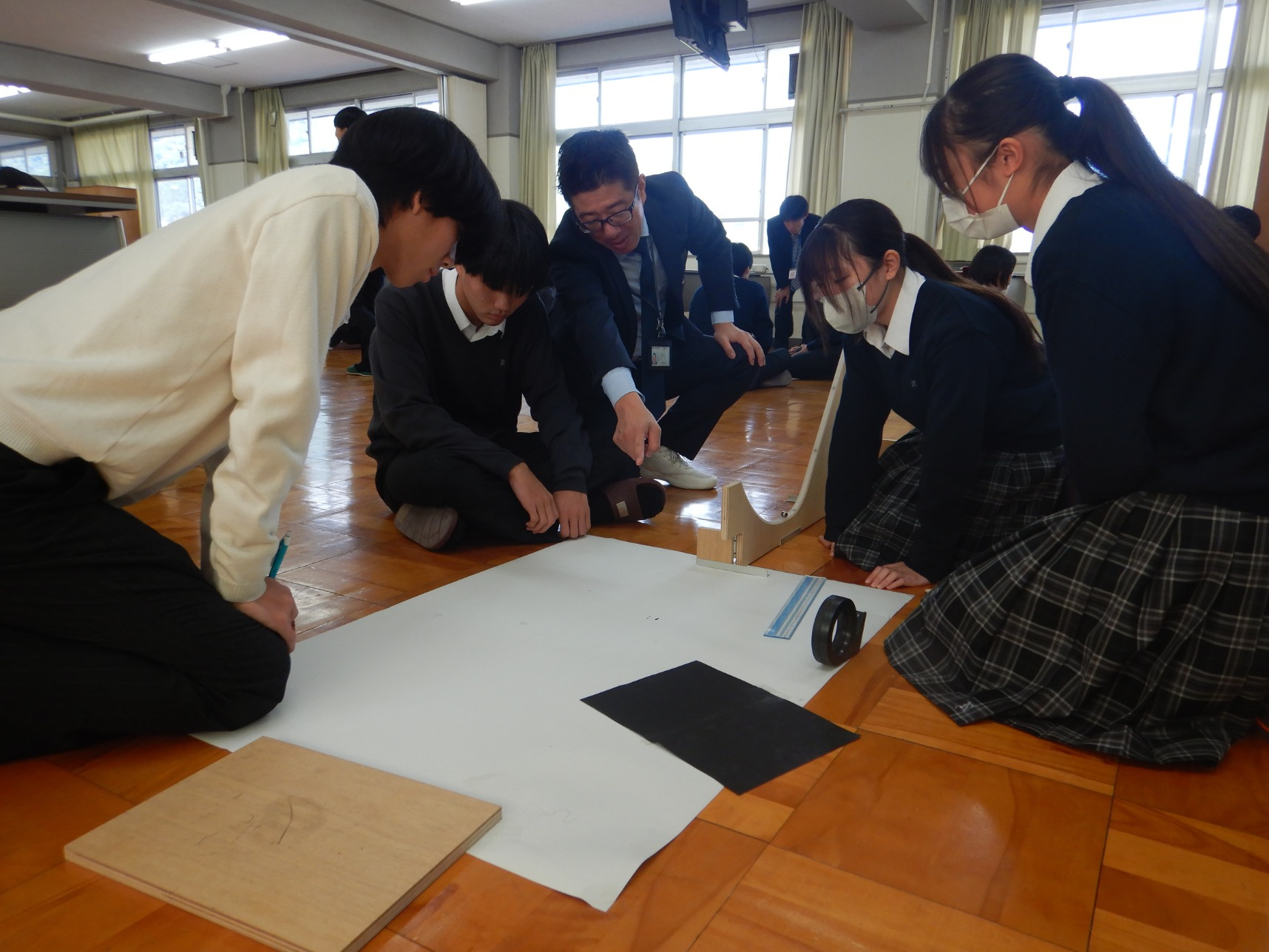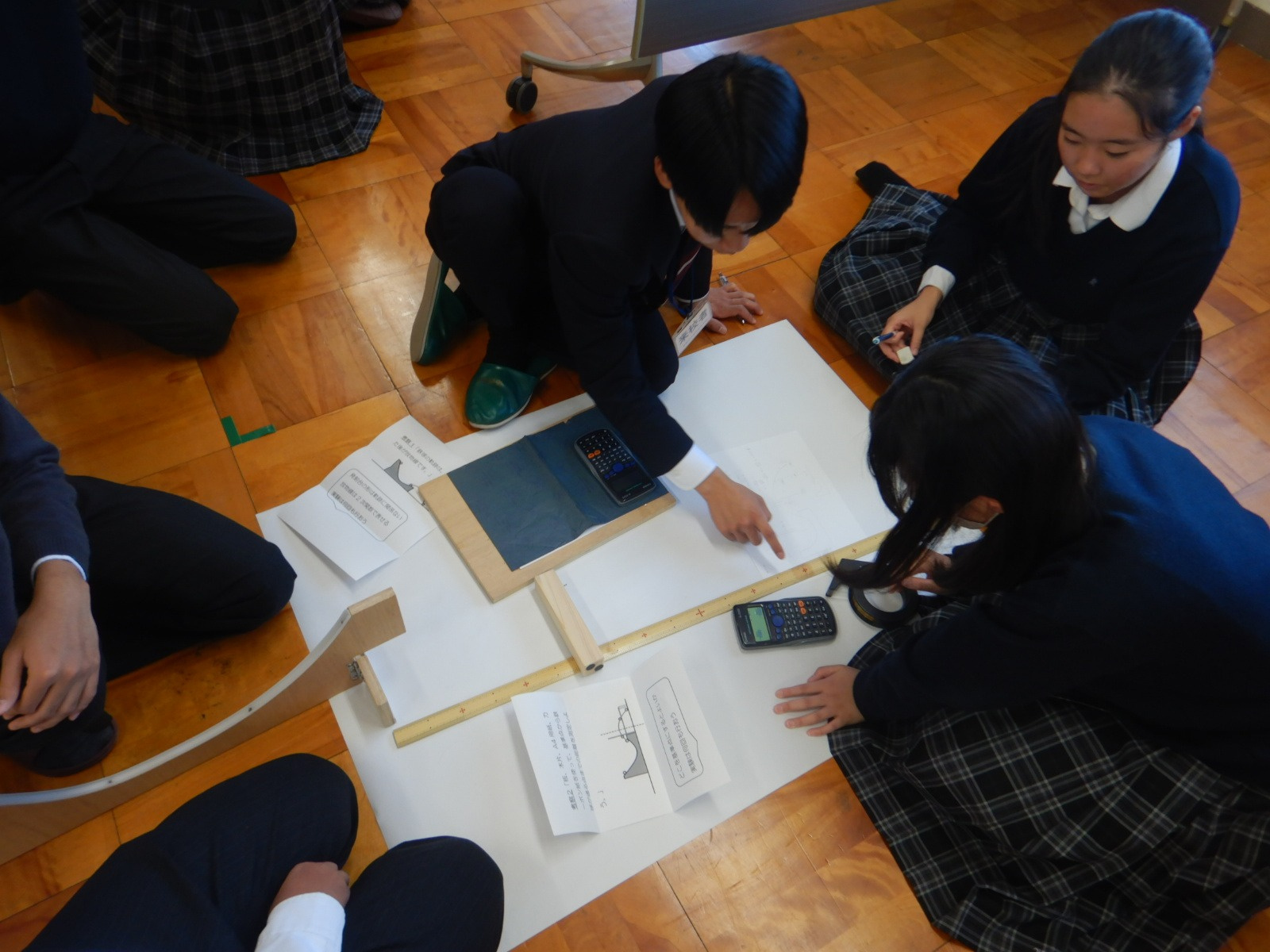 「途中式がどうしても成り立たなかったりデータを正しく取れてなかったりで苦戦したけれど、班の人と協力し龍谷大学の大学生にも色々とサポートしてもらって解くことができた。本番の検証に入るギリギリまで計算していて、結果的に無事にペットボトルの中に鉄球を入れることができたので頑張った甲斐があったなと思った。とても楽しかったのでまた機会があれば同じような授業形式のものを受けてみたいと思った。」
