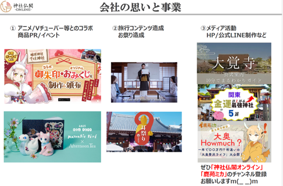 河村さんが代表を務めておられる株式会社神社仏閣オンラインは、「①文化協創、②地域共助、③核心遵守」を重視して、「日本文化の担い手と、社会を結び、未来につながる新たな価値を創る会社」です。