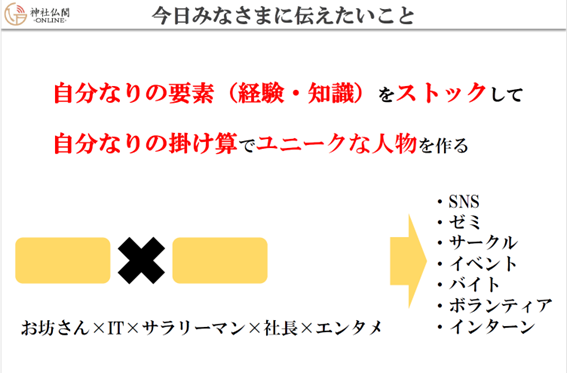 ご講演では、この源泉を「自分なりの要素(経験・知識)をストックして、自分なりの掛け算でユニークな人物を作る」ことだ、と教えてくださいました。