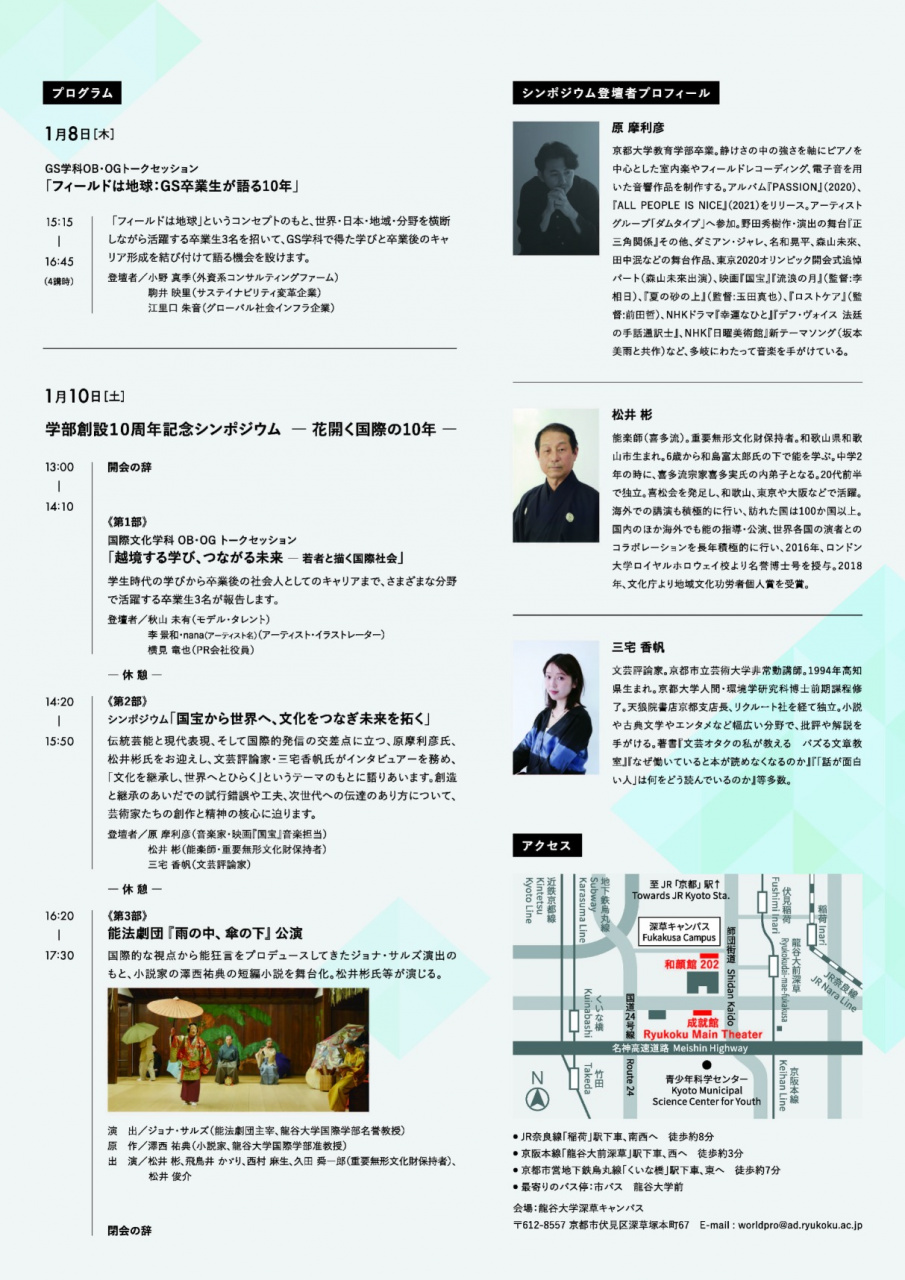 本シンポジウムでは、10年のあゆみを振り返りつつ、学生・卒業生・教員・文化人が一堂に会し、これからの国際社会における学びと文化の役割を多角的に考えます。