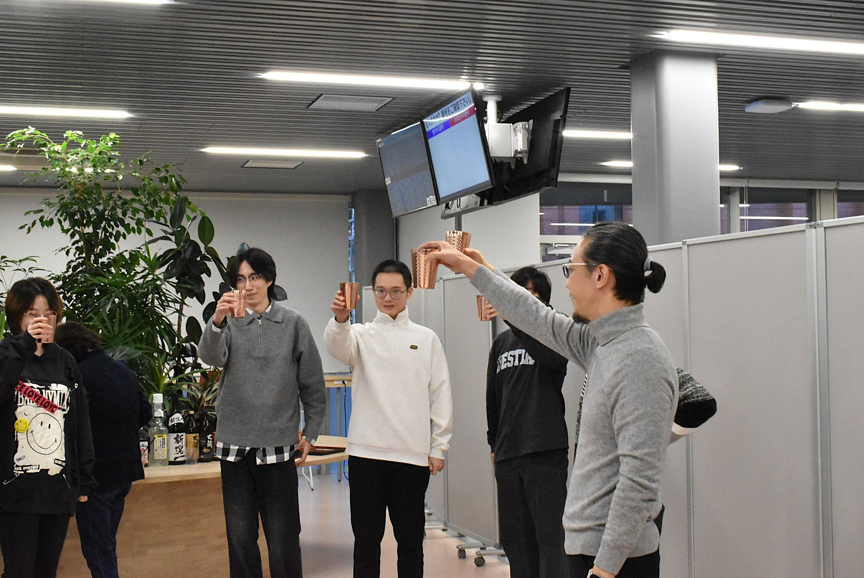 中間報告会終了後には、教員と大学院生の慰労と今後の活躍を願い、懇親会が開催されました。会場は聞思館に新設された大阪王将の一角をお借りし、和やかな雰囲気の中で研究や進路についての意見交換が行われ、交流を深める貴重な時間となりました。
