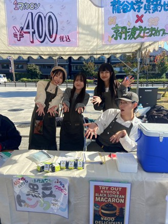 近年、不作によって出荷できない黒豆が増えており、農家の方々はその再利用方法を模索していました。しかし、現状では主にきな粉に加工する程度しか活用法がありません。そこで私たちは、黒豆に新たな可能性を見いだすとともに、若い世代の“黒豆離れ”を少しでも改善したいという思いから、SNS映えを意識した「黒豆トゥンカロン」を開発しました。私たちが販売したトゥンカロンとは韓国語で「ふとっちょマカロン」という意味です。イベント当日は90個用意し、大学生や海外の方など様々な方に購入していただき、「おいしい!」と高評価をいただくことができました!そして無事全て売り切ることができました!!ありがとうございました!