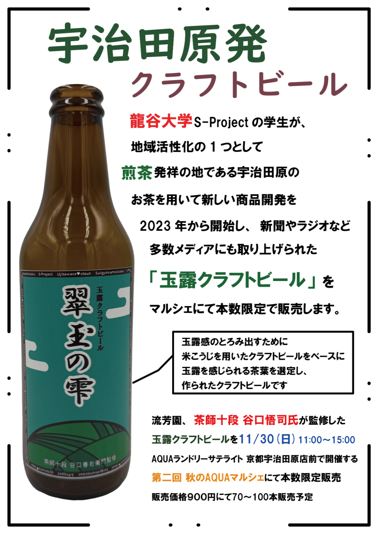 - 龍谷大学の学生が宇治田原町の新たな特産品を作るため、老舗お茶屋である流芳園の代表であり茶師十段の谷口悟司氏の協力のもと、クラフトビール『翠玉の雫』を開発。初めての試飲・販売会を開催。