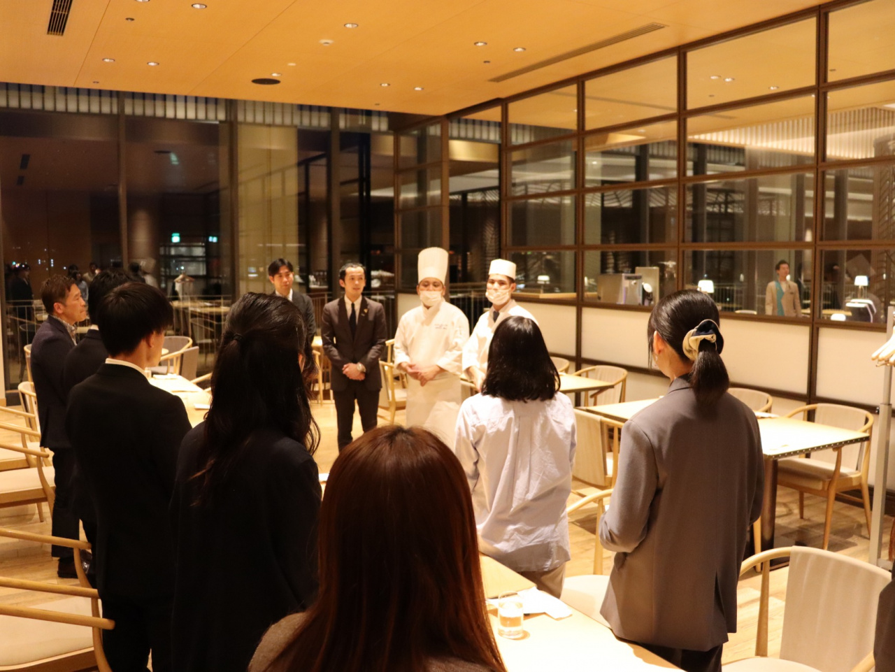 成果報告会では学生たちがメニューに込めた思いや苦労した点、得た学びなどを発表しました。学生たちはオリーブ茶の風味を引き出すための工夫について、ホテルシェフと議論や試作を重ね、納得するメニューを仕上げました。大学での学びでは得ることのできない貴重な経験に多くの気づきを得たようでした。