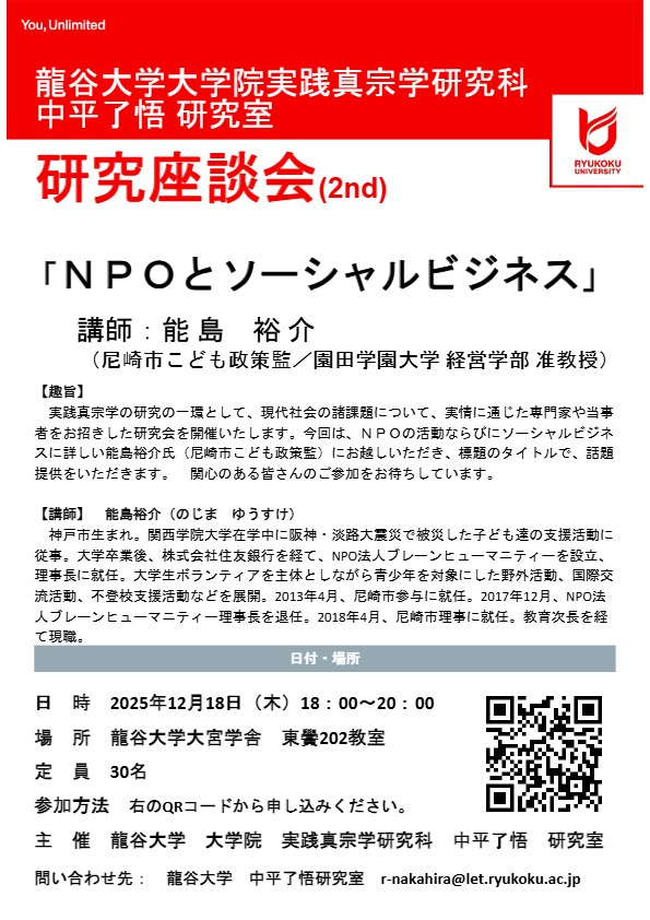 研究座談会(中平了悟先生研究室)『テーマ:NPOとソーシャルビジネス』を開催します(2025年12月18日)【実践真宗学研究科】