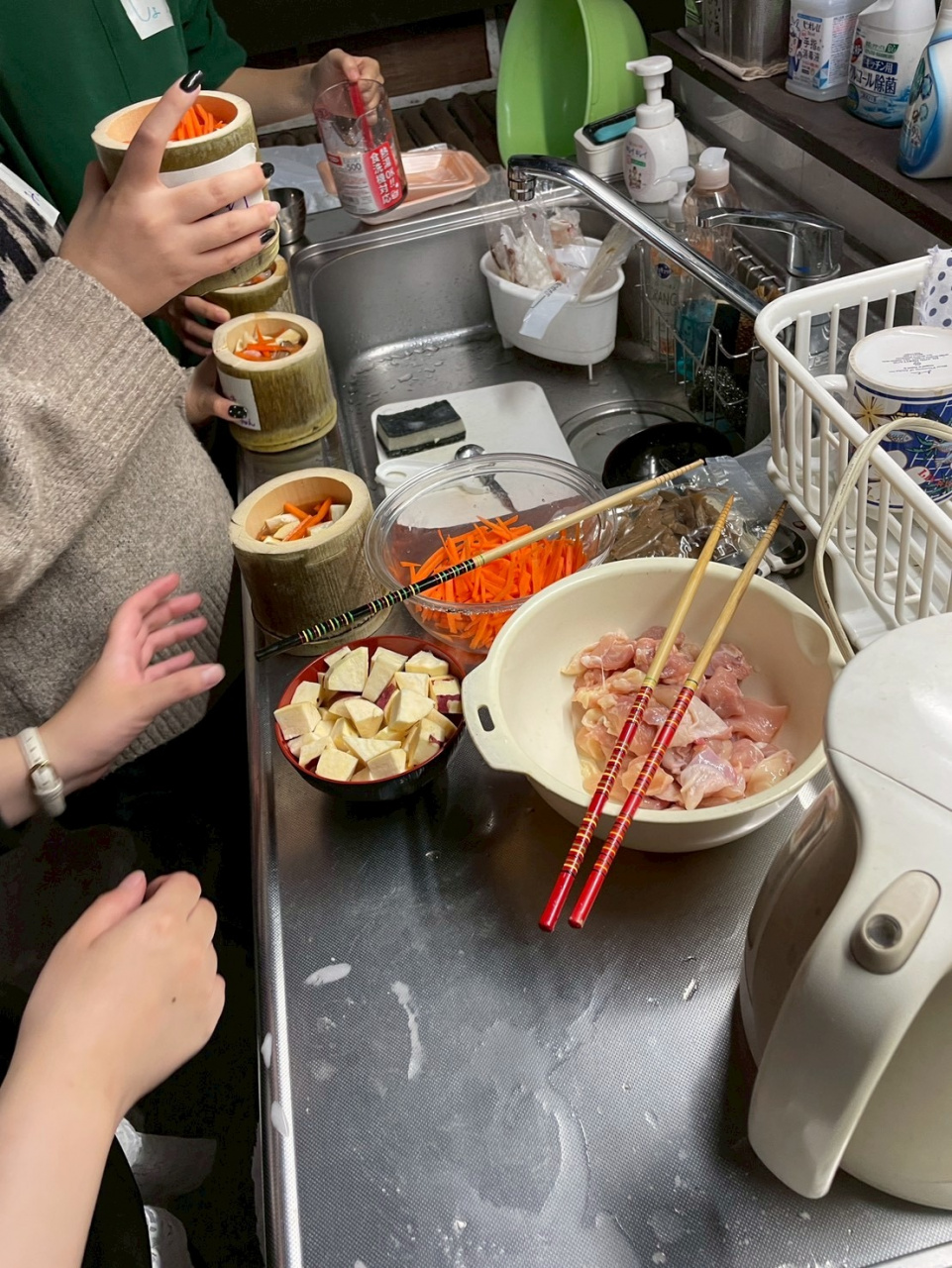 クイズが終わる頃に、竹筒ご飯が完成しました。先ほど自作した竹箸を使って、竹筒ご飯を食べながら交流を深めました。