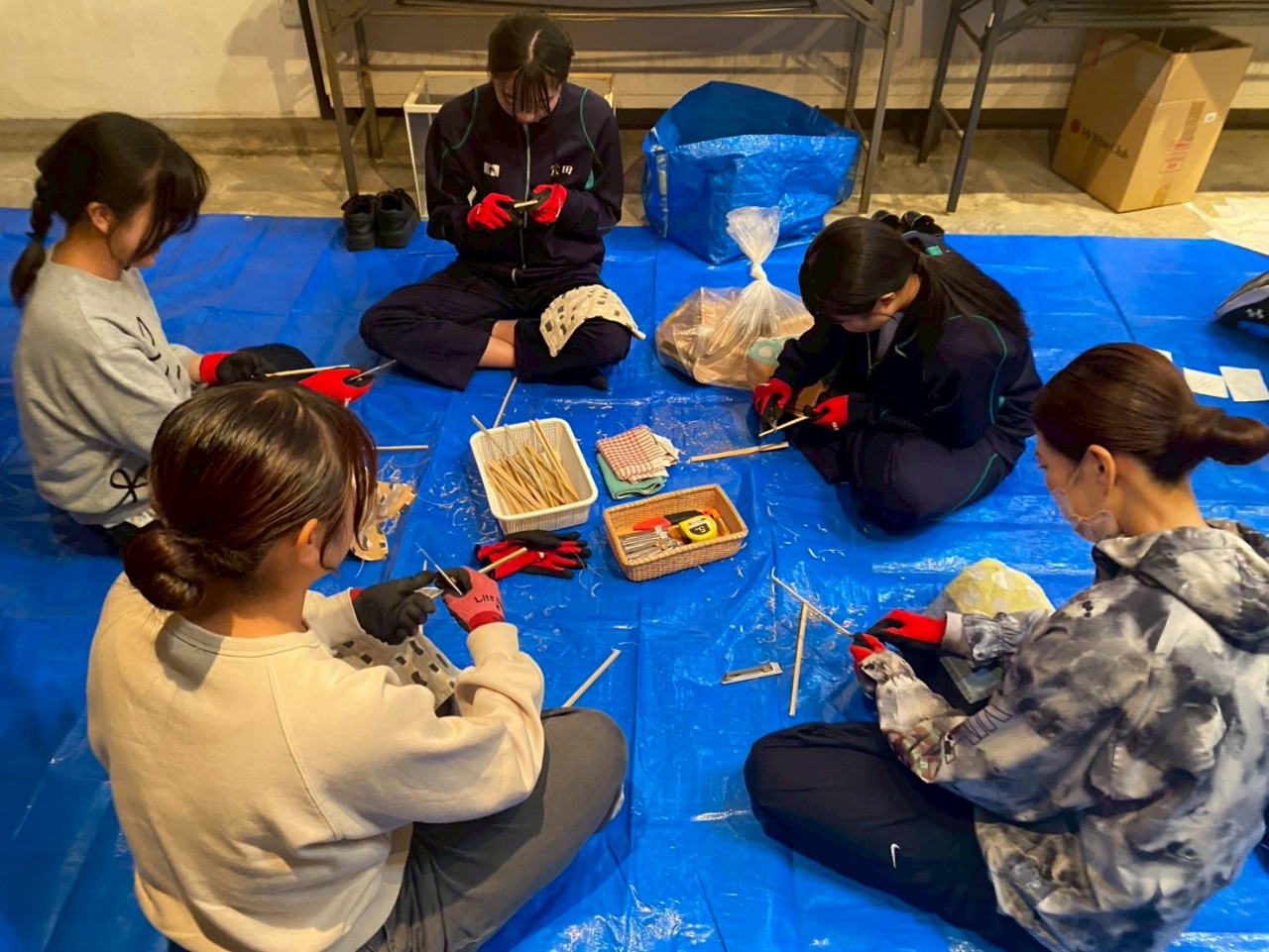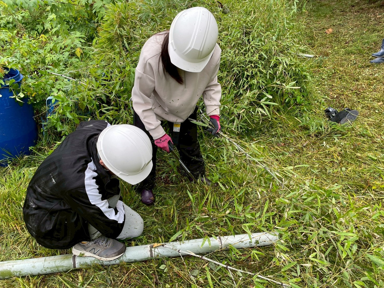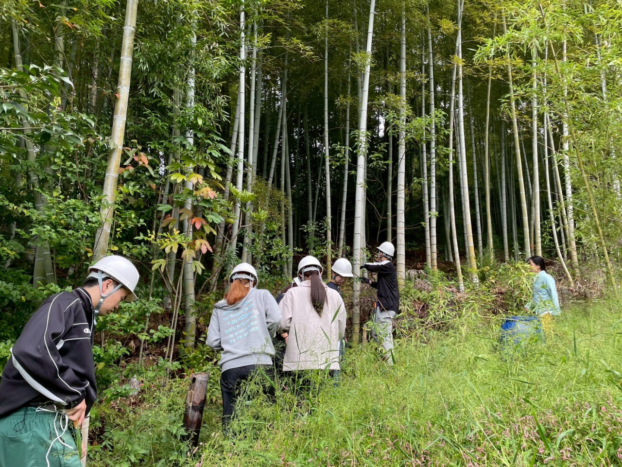 受講生たちはこのイベントに先立って、当日に使用する竹を自分たちの手で伐採してきました。いつもお世話になっている深草地域在住の農家である杉井さんが管理されている竹林にて、モウソウチクを収穫させていただきました。切り倒したモウソウチクは小分けにして持ち帰り、消毒と乾燥を行いました。この竹を用いて竹筒ご飯や竹工作を高校生に体験してもらうため、何度も試作を繰り返してきました。