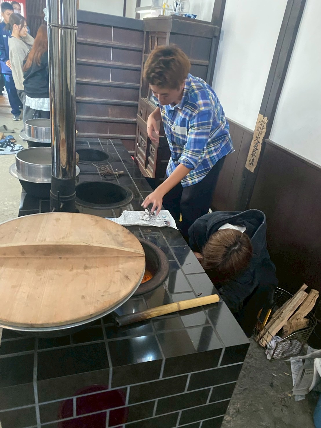 次に、竹筒ご飯に入れる好きな具材を高校生に選んでもらいました。薪を割り、かまどに火を起こして、竹筒を蒸してご飯を作りました。
