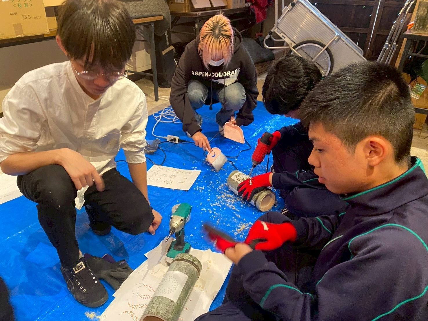 竹筒ご飯を蒸している間に、竹箸と竹灯籠の工作体験を実施しました。竹箸作りは単純な作業ながらも夢中になってしまう魅力があり、談笑しながら満足のいく形に仕上げていきました。竹灯籠作りは、型紙の上からインパクトドライバーで穴を開けて、最後に灰で磨いて綺麗に仕上げました。