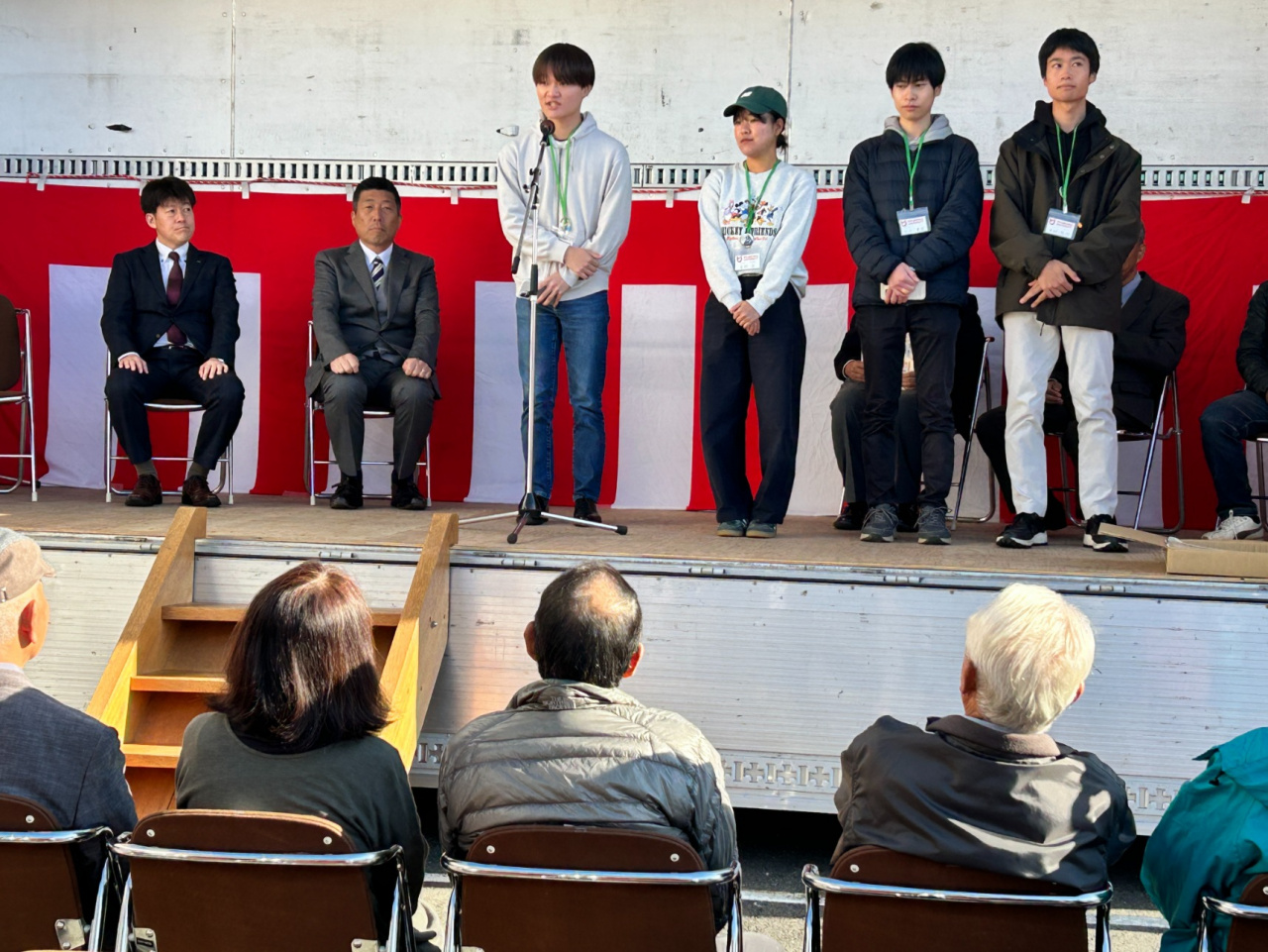 開会式で龍谷大学の活動について各班から説明したほか、30分間のステージ発表を行いました。冒頭に各班が考えている中六人部の地域課題と各班の活動との関連について説明し、以下の内容でステージを盛り上げました。