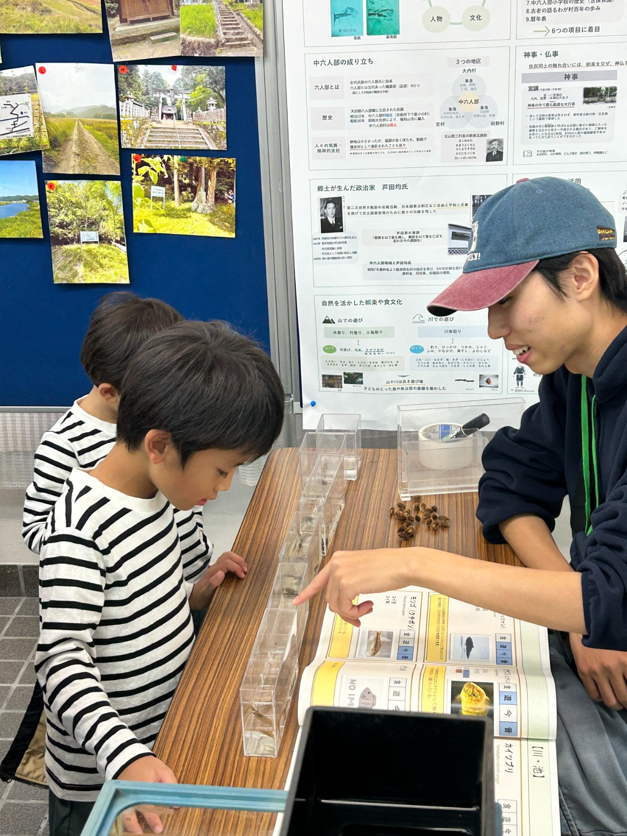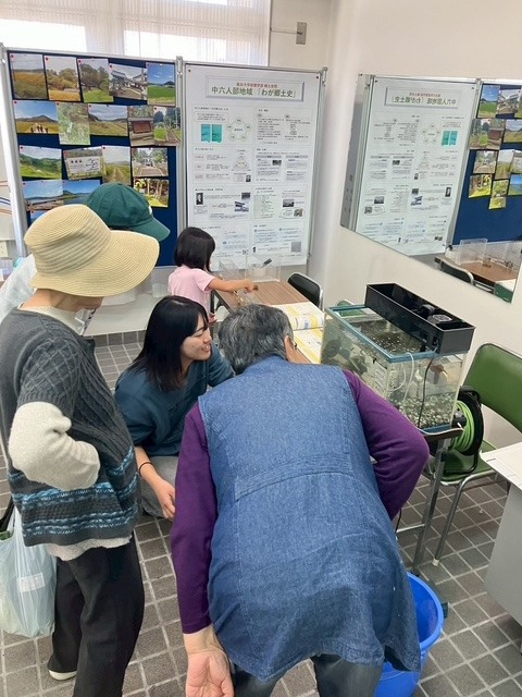 いきものがかりは、実際に中六人部の川で見つかった生き物を水槽に入れて生態展示をおこないました。特に子どもたちは地域の川にこんなに生き物がいるのか、と驚いていました。