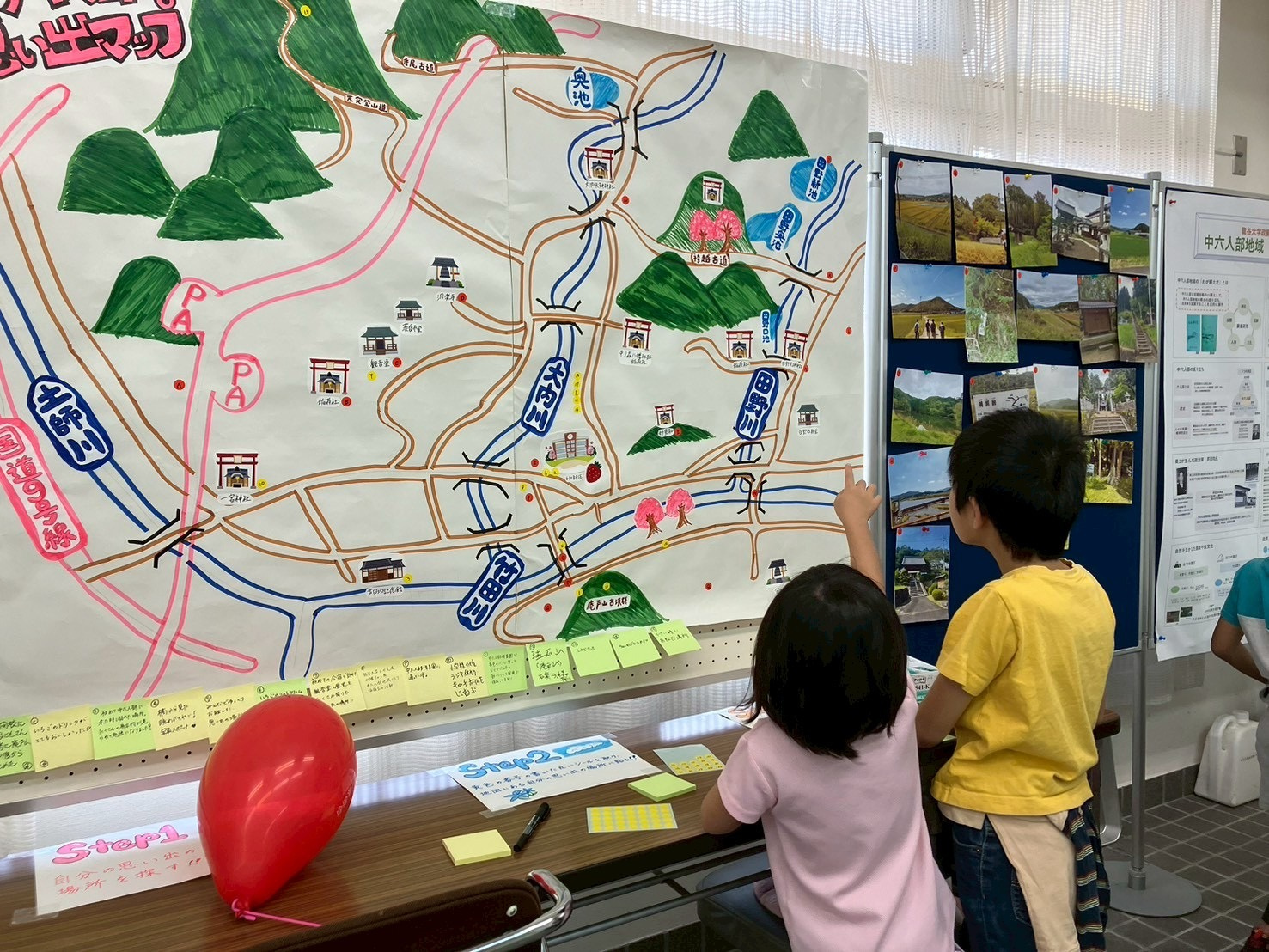 中六人部の秋祭りは収穫祭であり、農村物の品評会の表彰、展示販売も企画されました。また文化祭という意味で、保育園児から一般の方々のアート作品の展示も行われました。学生たちは展示コーナーの一角をお借りして、パネルによるプロジェクトの紹介、各班の活動紹介をしました。フットパス班はパネルを利用して、参加者から写真の場所に関するエピソードを書き出していただきました。この情報をもとに次年度は新しいフットパスルートを策定しようと考えています。