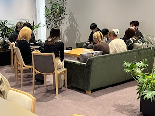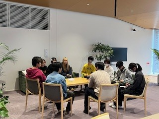 訪問の最後には、社内を見学させていただきました。部署ごとの仕切りのないフロアーの様子や、仕事をするデスクが固定されていないことなどを目の当たりにしました。また、1階の庭園にもご案内いただき、海外からのゲストを歓迎する際にも利用されているとの説明がありました。