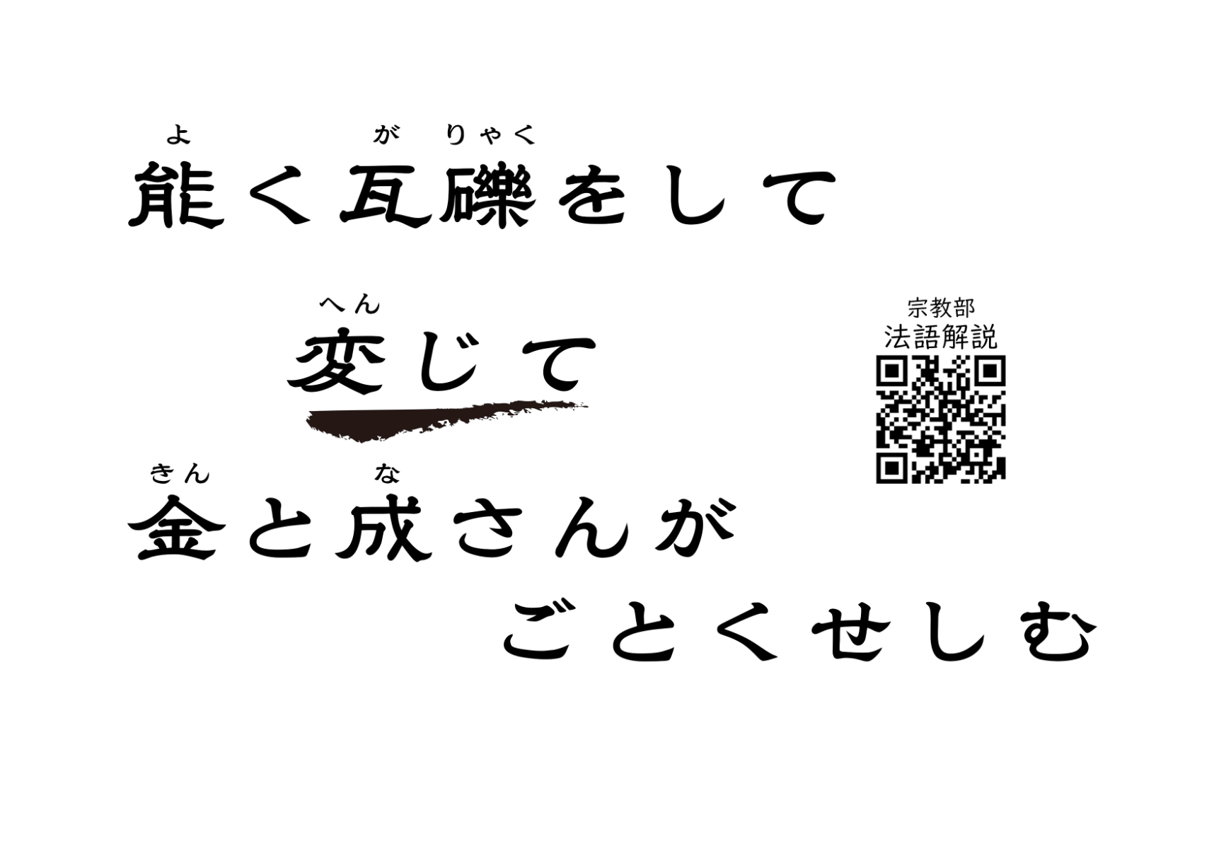 今回の掲示法語は親鸞聖人が書いた『唯信鈔文意』から紹介します。法語にある言葉は、中国の慈愍三蔵という方が、一切衆生を往生させようと誓われる阿弥陀如来の本願力を讃嘆した偈です。親鸞聖人はこの偈に解説を施されて、石・瓦(かわら)・礫(つぶて)のごとき我々であっても阿弥陀如来の摂取の光に遇ってこの上ない涅槃の境地に至らせていただく、つまりは金(こがね)になさしめられるのだとおっしゃいます。親鸞聖人にとって阿弥陀さまの教えとの出遇いは、まさに自分の人生のあり方を全く別のものに転変させられるようなものだったのでしょう。