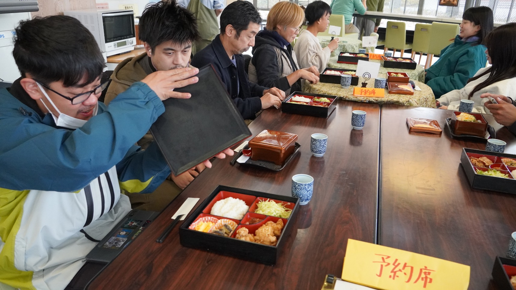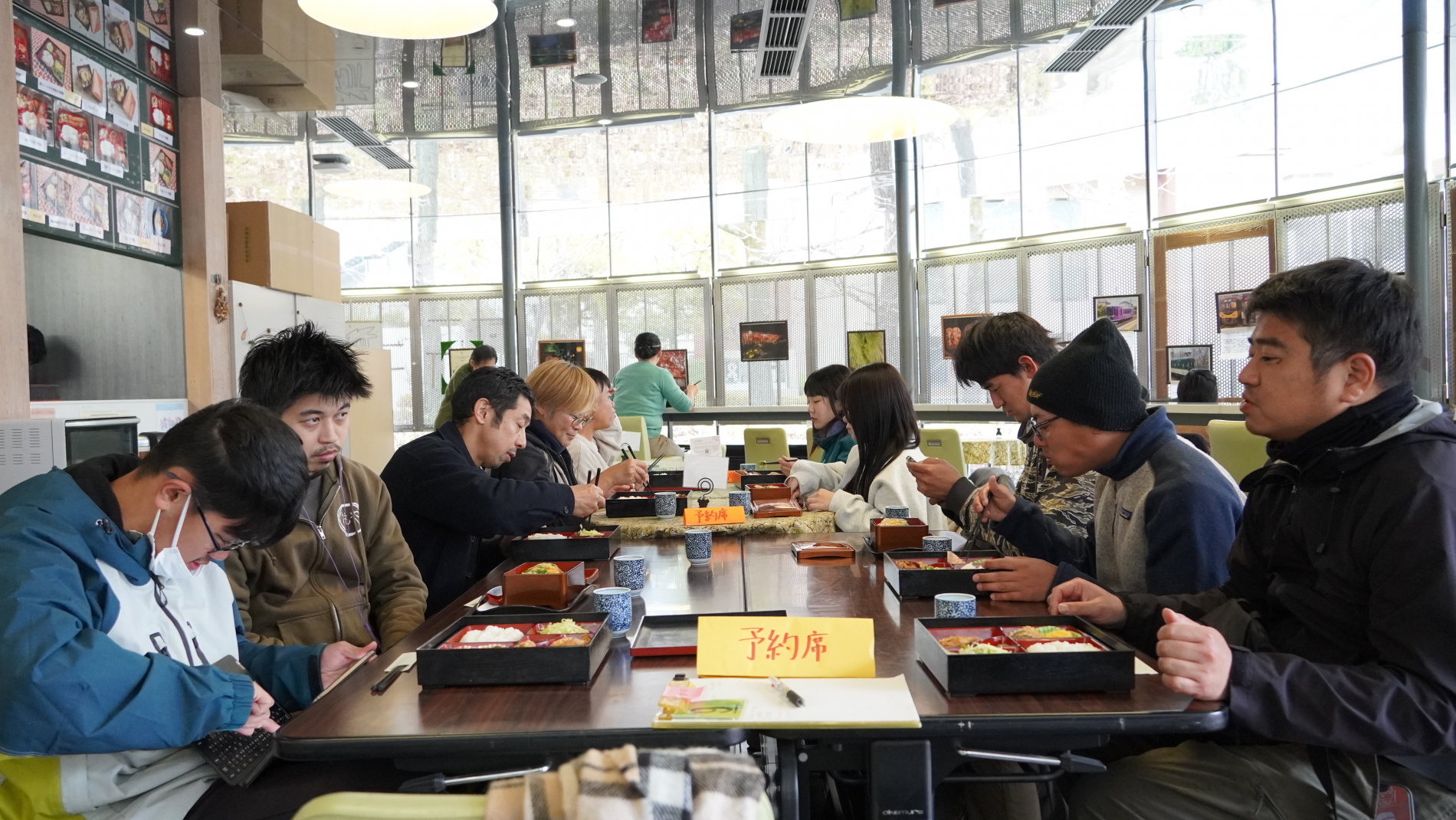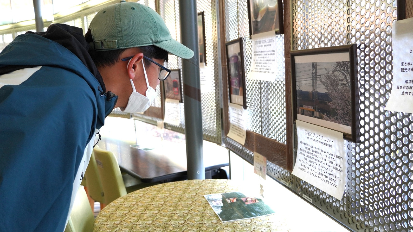 また、「café樹林」の壁面にはデリバリー担当のスタッフさんがプライベートで撮影した電車と風景の写真が飾られていて、電車好きの「おもや」利用者さんが楽しそうに見る様子がありました。