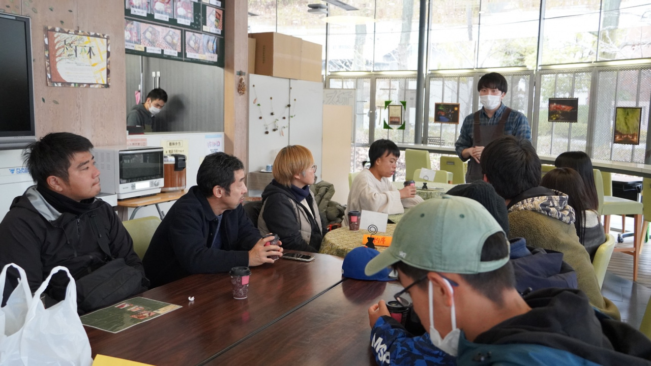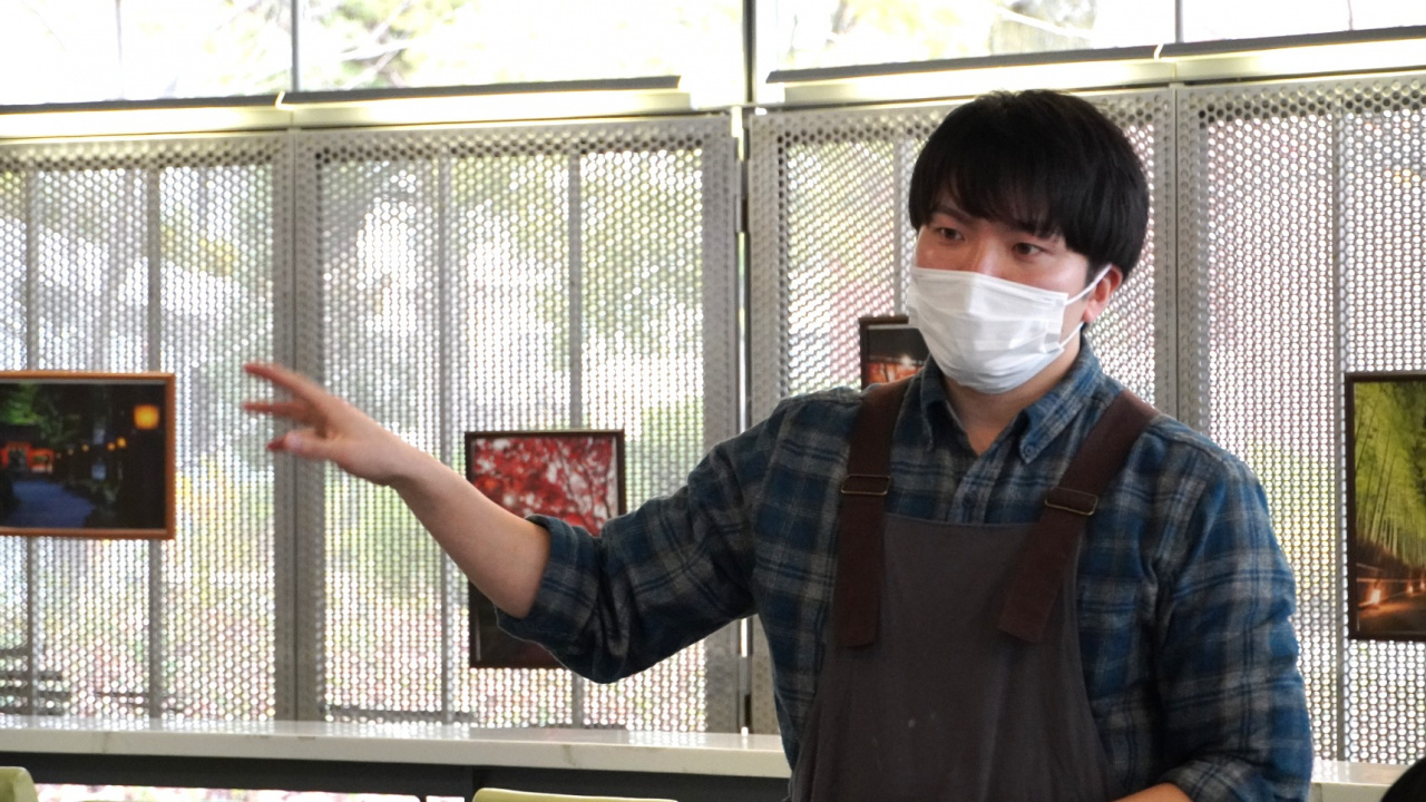 食事の後には、龍谷大学政策学部卒業生で「café樹林」で働く竹内悠真さんにお話を伺いました。竹内さんによると、現在働いておられるスタッフの方々は店頭で仕事をこなすまでに5年ほど修行をしておられるそうで、職場では「〇〇マイスター」という形でその仕事に責任を持ってもらう工夫や業務終了後の1時間でその日一日の振り返りを行い、その日の反省点を翌日に生かす工夫などをされているとのことでした。