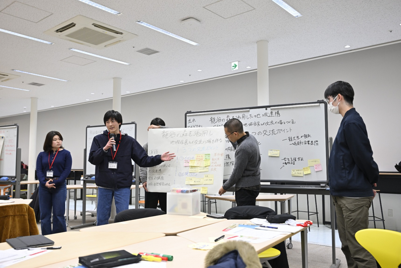 その後、的場 信敬教授(政策学部)より本取組の主旨説明が行われ、1日目は「『龍谷の森』の活用をテーマに、地域との連携も視野に入れた活用のアイデア」であることが発表されました。