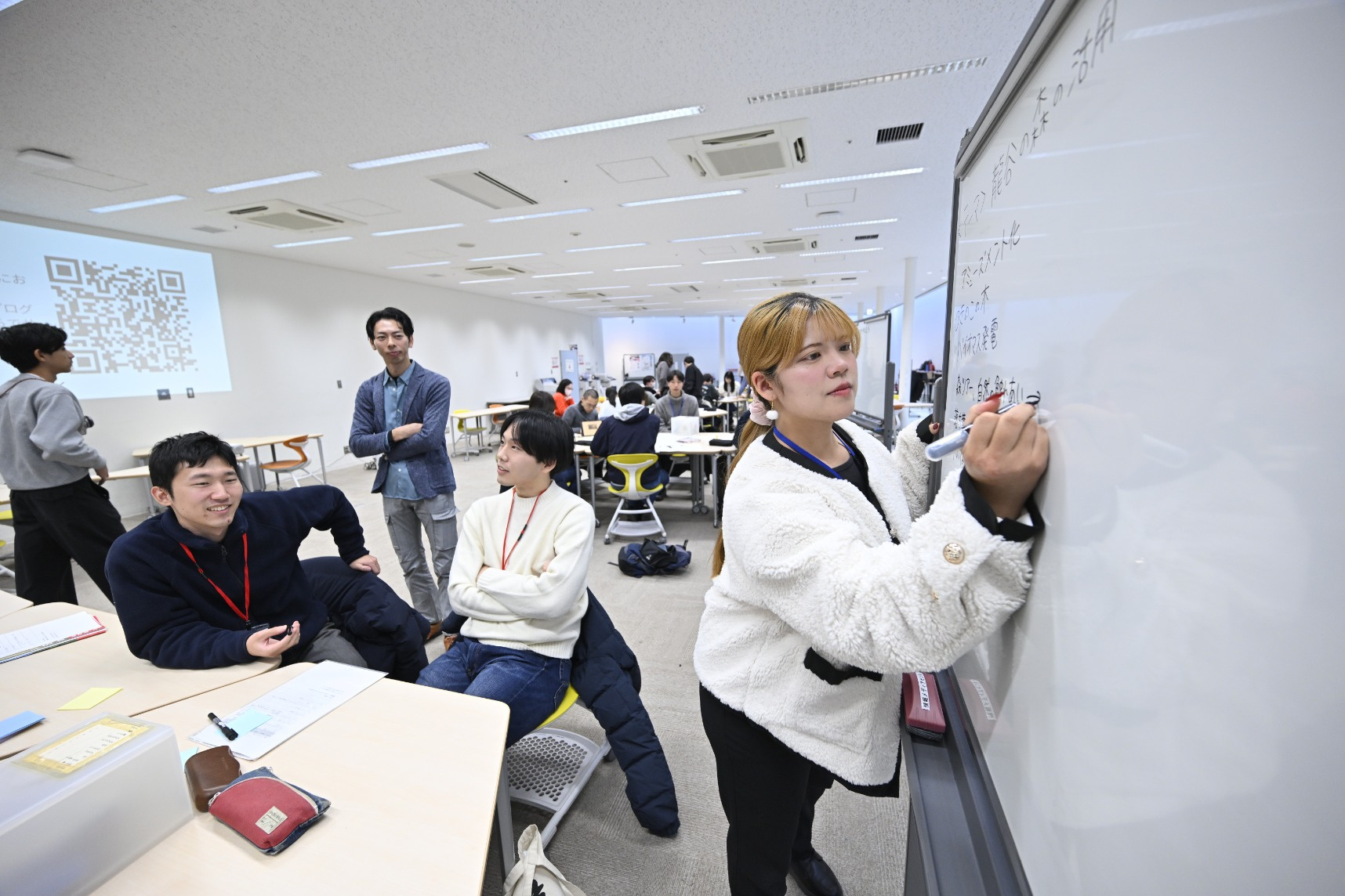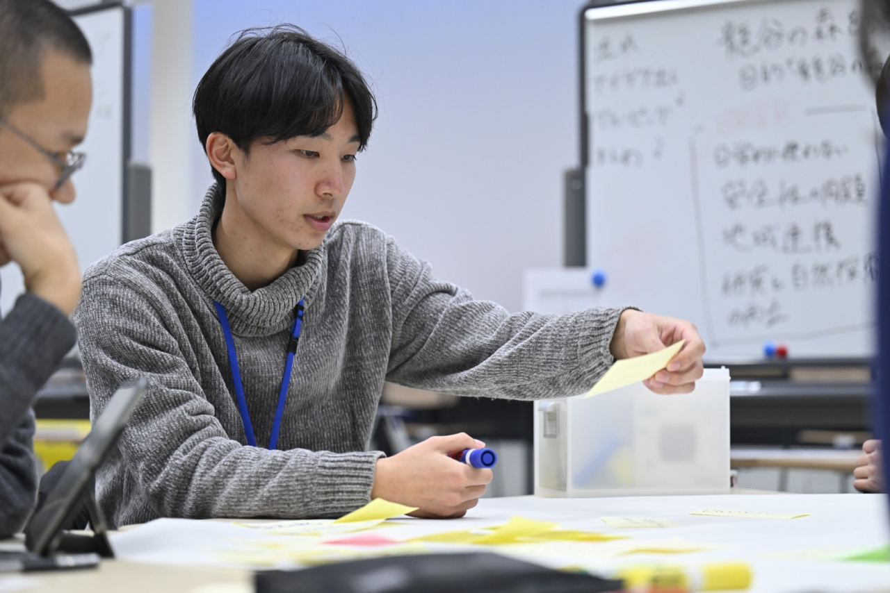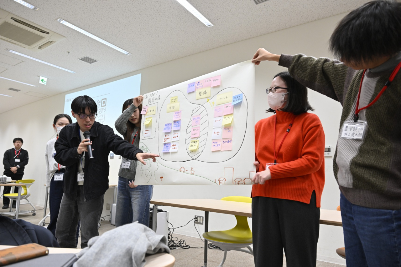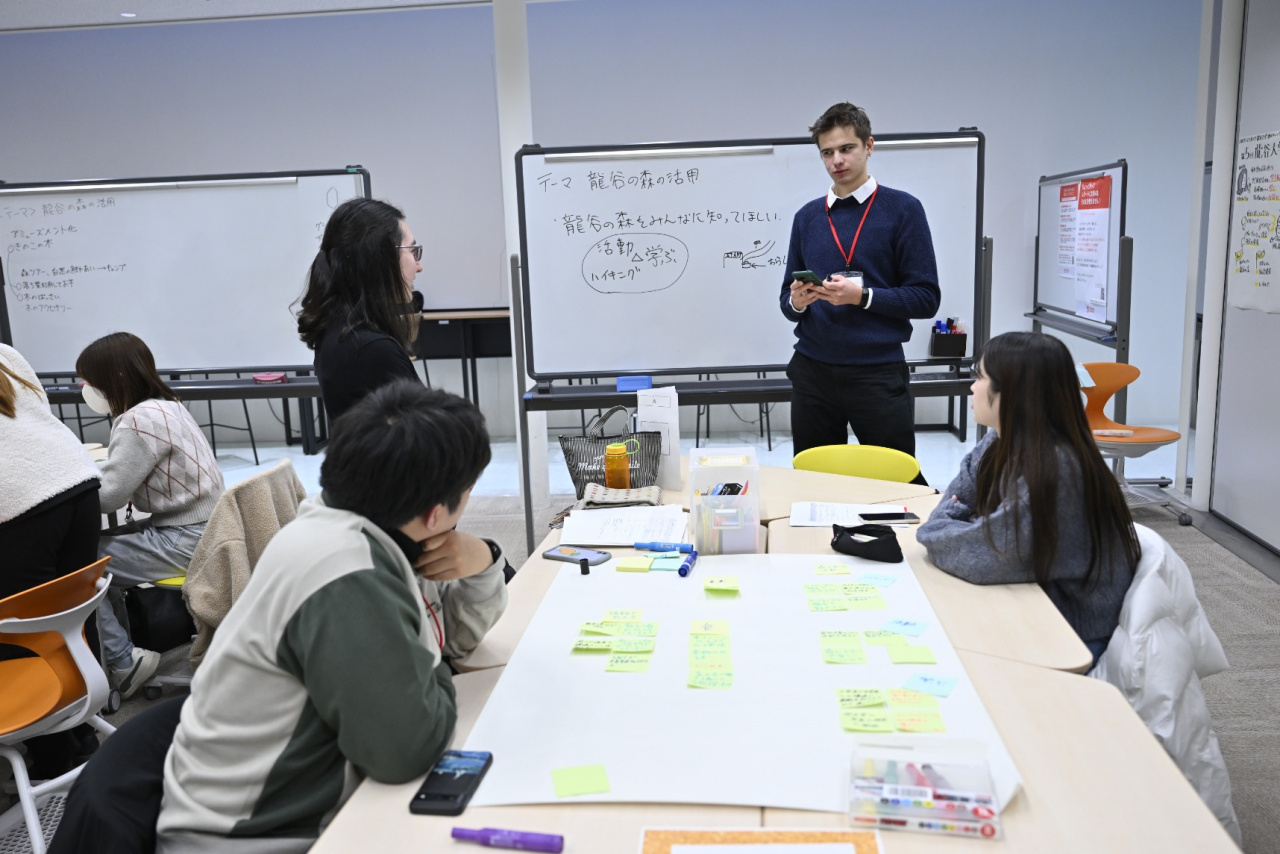 今までのカードゲームや講演内容、瀬田キャンパスや「龍谷の森」でのフィールドワークの内容を活かしながら、それぞれのチームで話し合った後、各チームのアイデアを発表して全体で共有し、地域との連携も視野に入れた様々なアイデアが出されました。