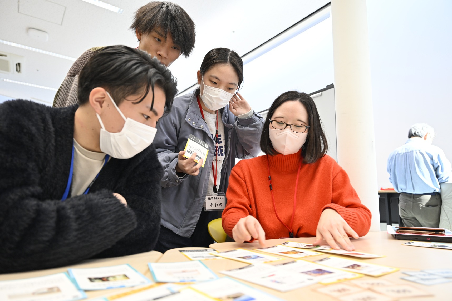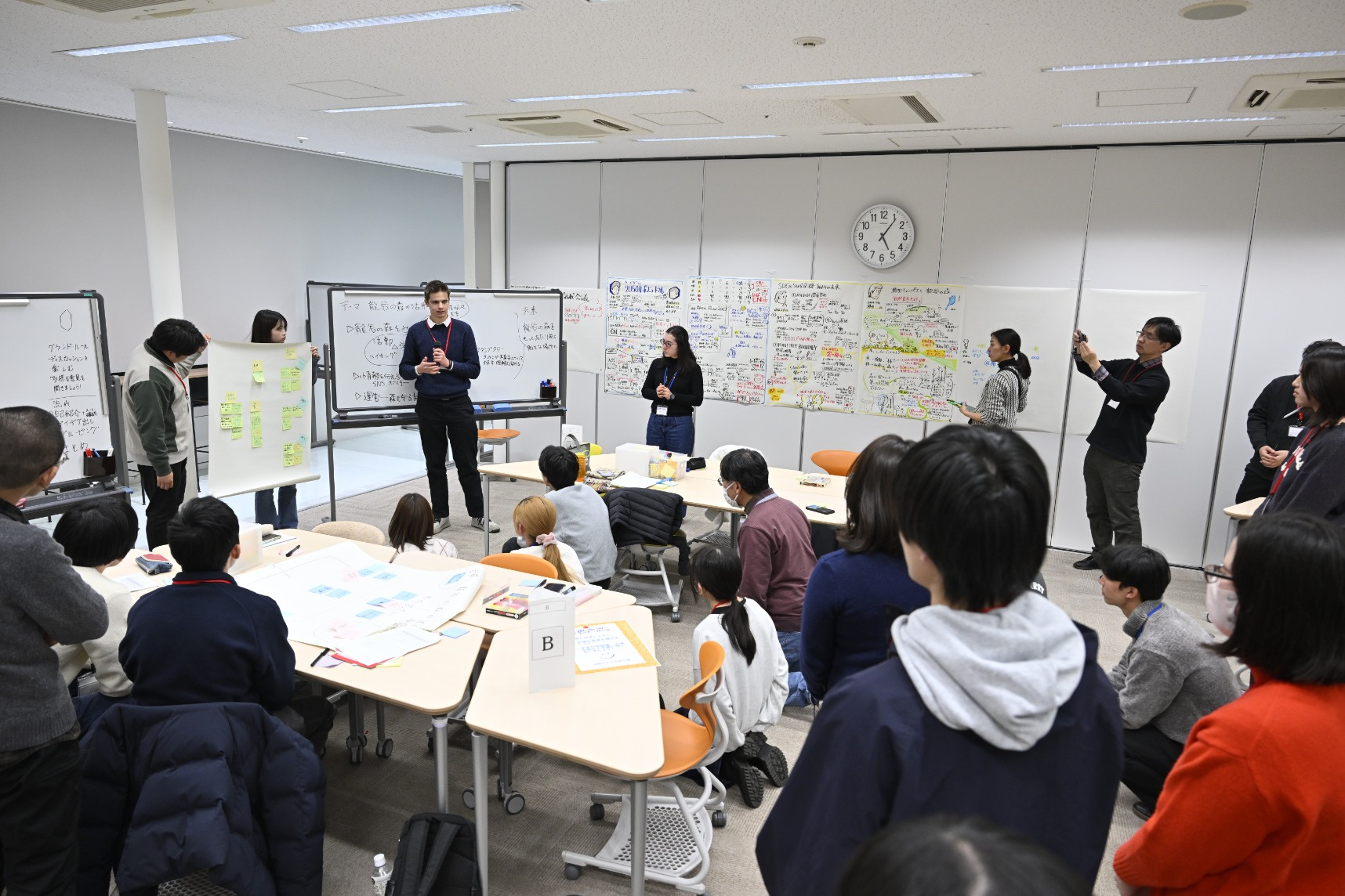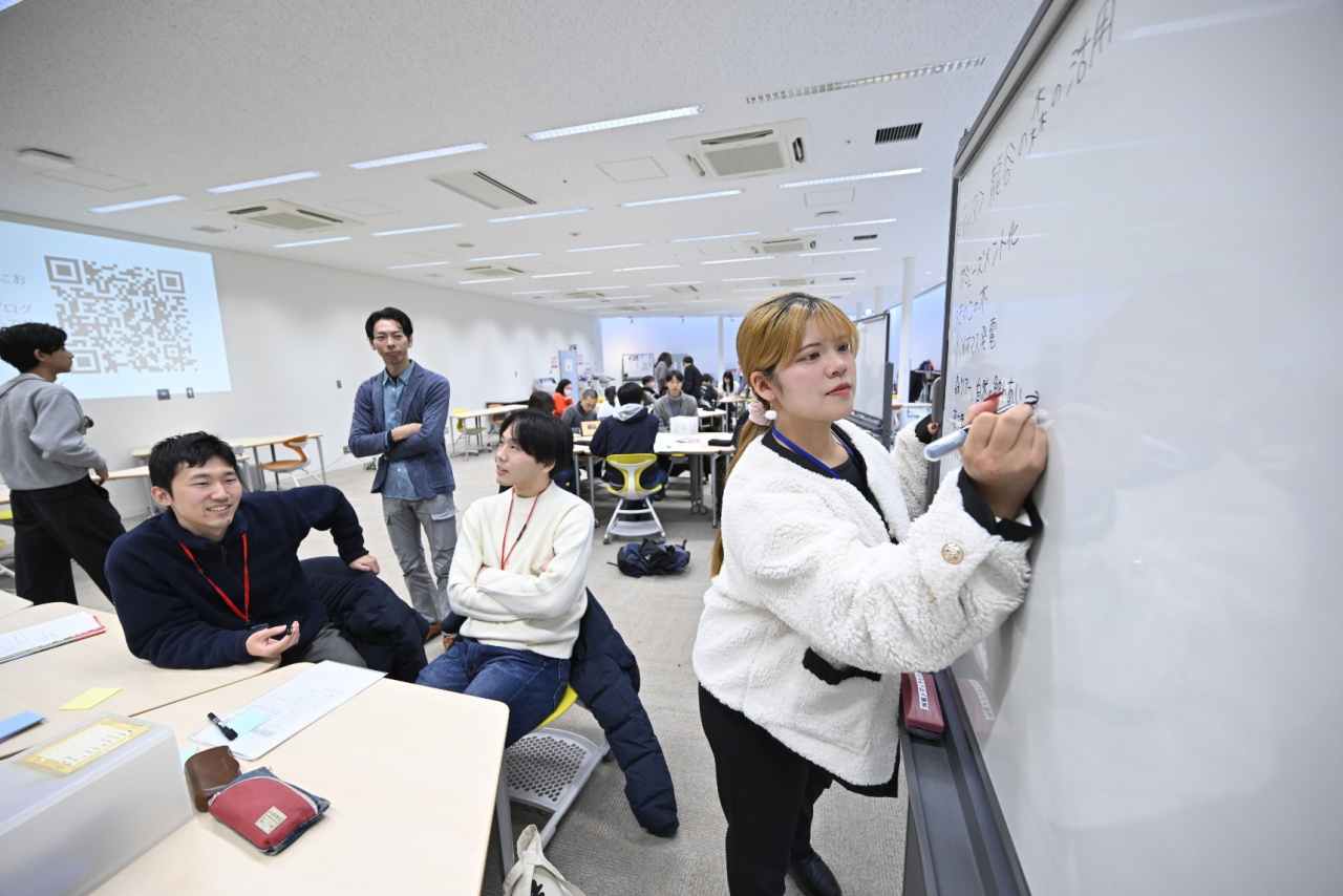 今までのカードゲームや講演内容、瀬田キャンパスや「龍谷の森」でのフィールドワークの内容を活かしながら、それぞれのチームで話し合った後、各チームのアイデアを発表して全体で共有し、地域との連携も視野に入れた様々なアイデアが出されました。