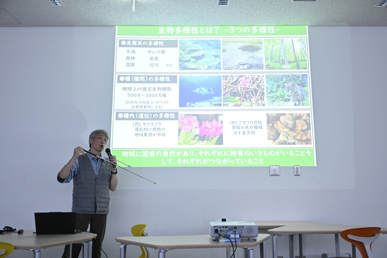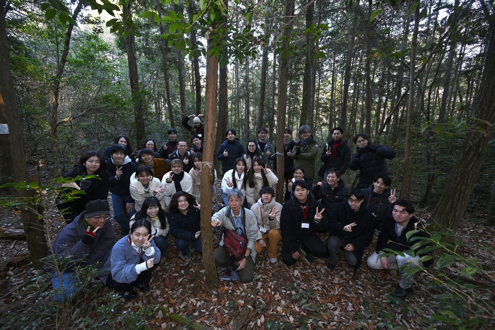 見学後、「森林の役割」や「森林のCO2収支」についての講義がなされ、森林の利用について考える機会となりました。(資料作成やフィールドワークについては、奥田 哲士教授(先端理工学部)にもご協力いただきました)