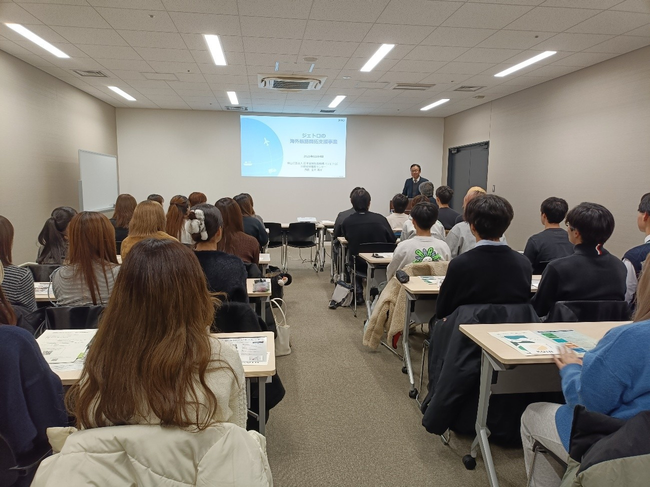 次に、フランスを中心に欧州での日系企業の支援を行ってきた金井善彦様(JETRO京都貿易情報センター所長)から、JETROの海外拠点の全体像、海外支援のサービスの各種説明や、日本人自身が意識していないが海外から評価されている事項などの説明を受けました。