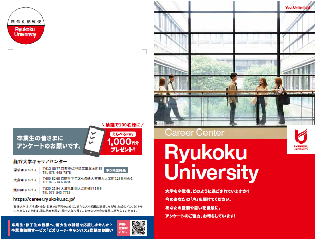 龍谷大学キャリアセンターでは、本学の教育プログラムおよびキャリア支援を検証し改善するために卒業後1年目および4年目の卒業生を対象として、毎年「卒業生アンケート」を実施しております。