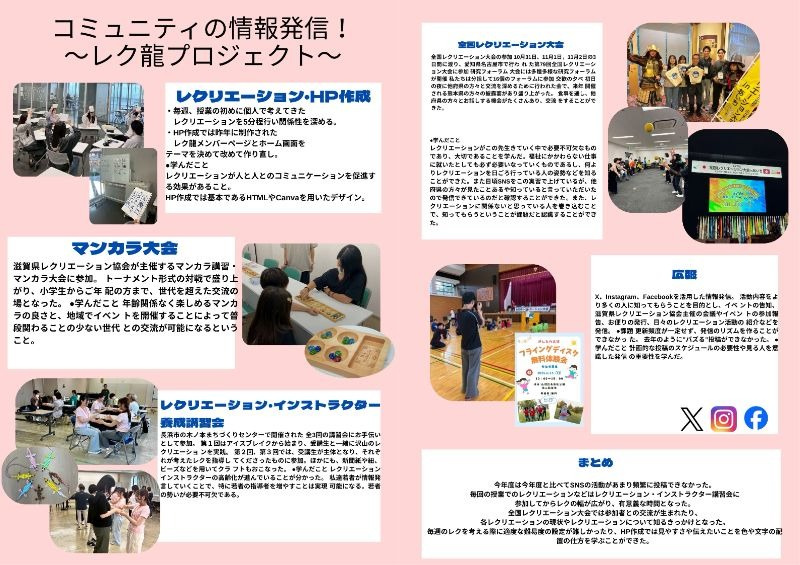 主な活動としては、滋賀県レクリエーション協会の広報媒体の運営です。X、Instagram、Facebookの3つのSNSを運営しています。投稿の内容は滋賀県レクリエーション協会が主催するイベントの告知はもちろん、毎回の授業で取り組んでいるレクリエーションの紹介などもおこなっていました。他の活動として、滋賀県レクリエーション協会の運営指導部会への参加や地域イベントへの参加、全国レクリエーション大会にも参加しました。