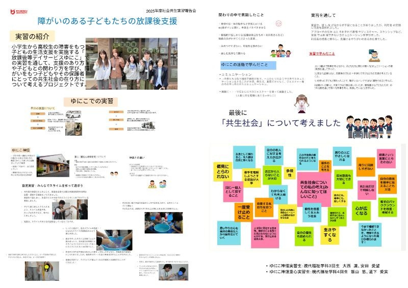 障がいのある子どもと関わる際に、なんとなく感じていた不安を取り除けたことは、大きな財産となりましたが、現時点では彼らとの「共生社会の実現」は考察だけで終わっています。今後、今回の経験をそれぞれの場所で活かし、周囲に語ることで子どもたちへの理解を促し、障がいのある子どもたちにとって過ごしやすい社会の実現に貢献していきたいです。