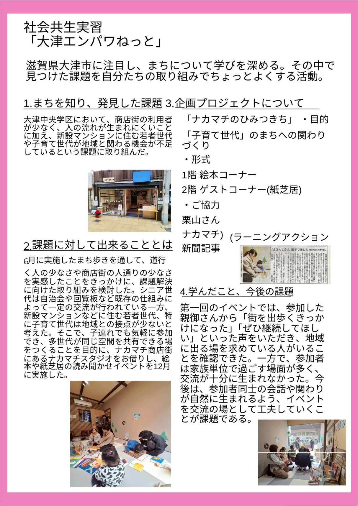 本プロジェクトは、滋賀県大津市中央学区を中心にまちづくりに取り組むプロジェクトです。地域の方と関わらせていただく中で、学生自身が地域の課題に気づき、その課題を解決する手段を考えることを目的としています。