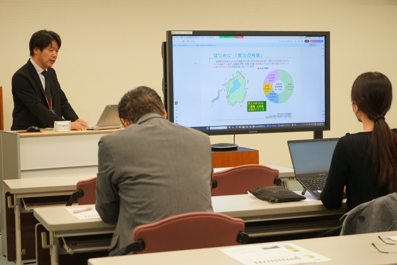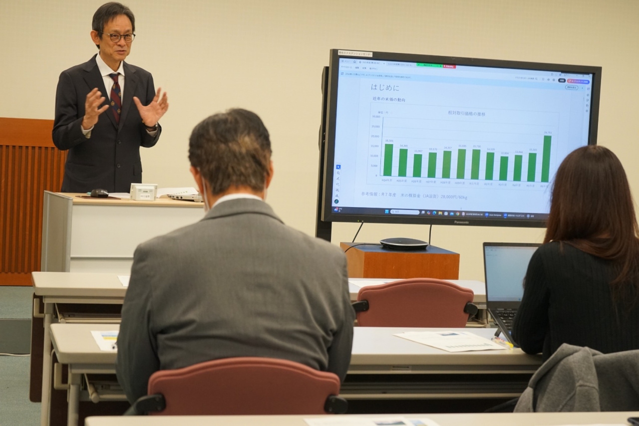 本研究会では、技術進歩の計測、技術効率(経営効率)の分析、経営規模の拡大による規模の経済、生産性の伝播速度の紹介と滋賀県の農業・水産業の概要と県が取り組んでいる政策を本学教員、滋賀県職員からそれぞれ講演しました。