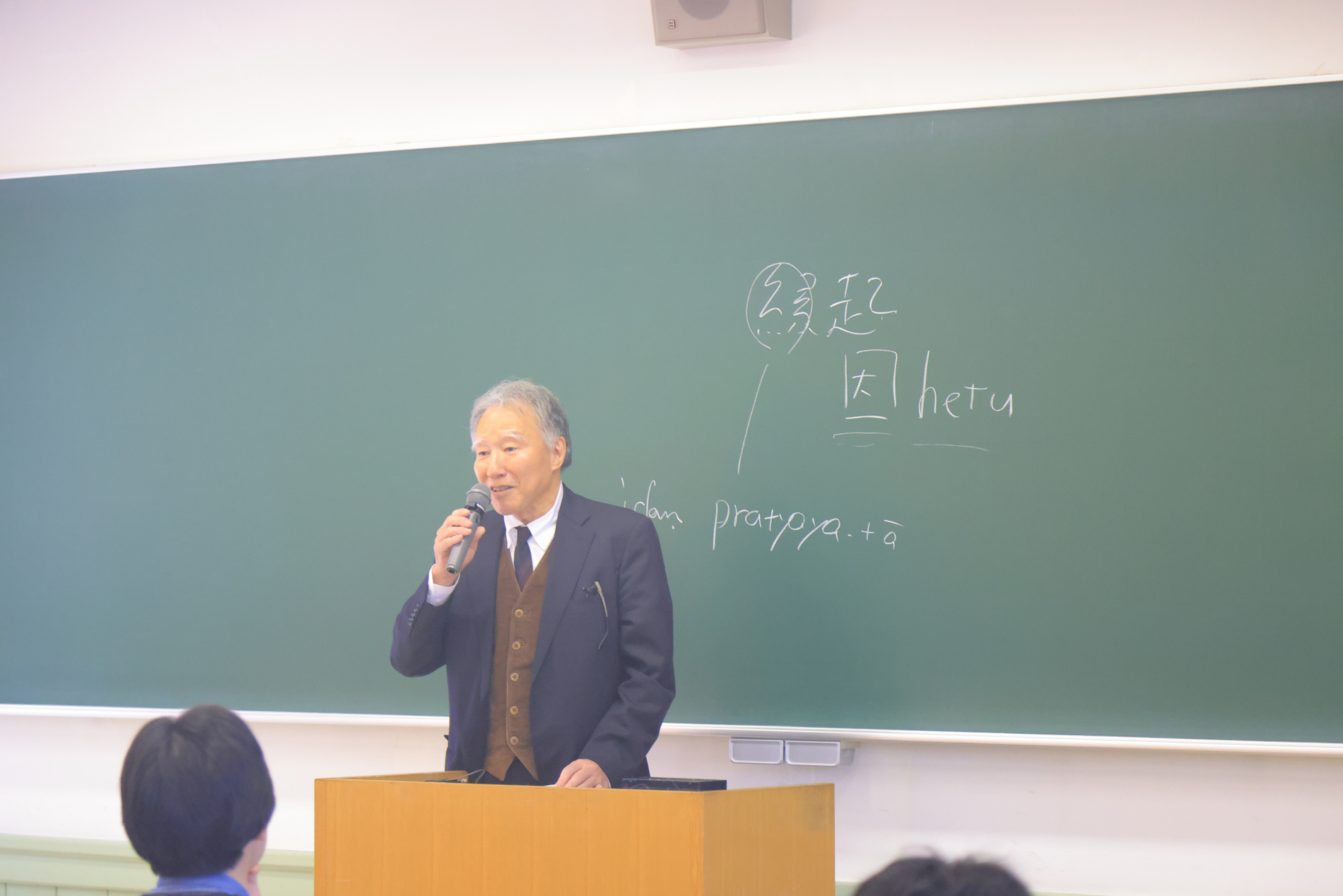 最終講義では「観無量寿経―仏説と密意―」と題してご講義いただきました。その内容は、「『観無量寿経』は仏説か?」という問いに始まり、『観無量寿経』の成立について多角的視点から検討するものでした。特に仏教相承の過程で教えが失われていく様相と仏語解釈の展開について述べられる中では、ご自身の豊かな体験を盛り込みながらエネルギッシュにお話しくださいました。