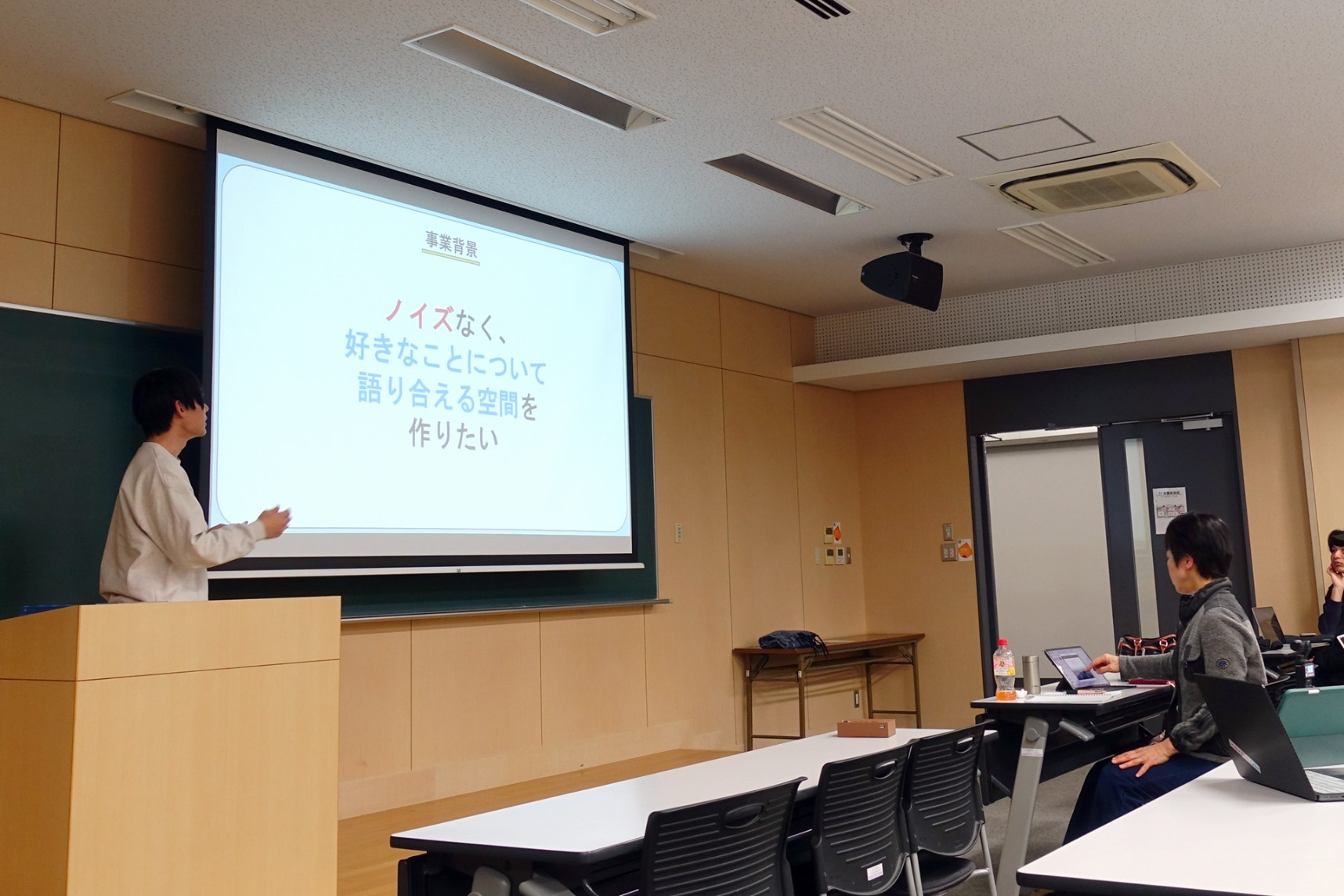 「ビジネスプランを考えるという他の授業では触りしかしないことを15回の時間をかけて先生にみっちり考えられたのが面白かった。企業している人が審査に来てくださり、コメントをいただいたのもありがたかった」