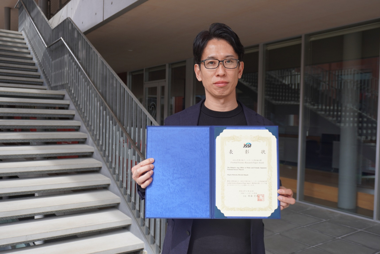 サッカーに関する研究を長年行ってきた結果として、このような名誉ある賞をいただくことができ、心から嬉しく思っています。本論文はサッカー日本代表選手の相対年齢効果について分析しています。「相対年齢効果(RAE)」とは、同じ学年内での誕生日の早い・遅いが学業やスポーツの成績に差をもたらす現象のことです。私自身、数年前まではこのテーマを深く意識したことはありませんでしたが、調べてみると非常に興味深いテーマであることを知り,研究を進めてまいりました。相対年齢効果に関する知見は、スポーツの指導現場や教育現場において、選手や子どもの可能性をより公正に評価するために有益なものです。本論文や関連論文を通じて、相対年齢効果への理解が社会全体に広まることを願っております。