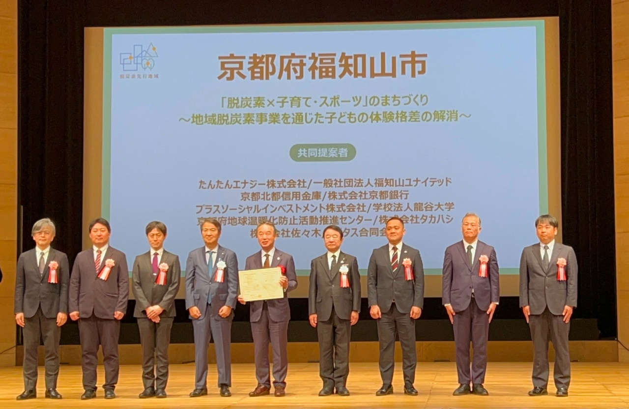 環境省が全国から提案募集を行っている「第7回 脱炭素先行地域」に京都府福知山市が選定され、2月20日に記者発表会が行われました。本事業には龍谷大学政策学部の的場信敬教授が共同提案者として参画し、地域の脱炭素化と子どもの体験格差の解消をめざす取組に学術的な立場から寄与しています。