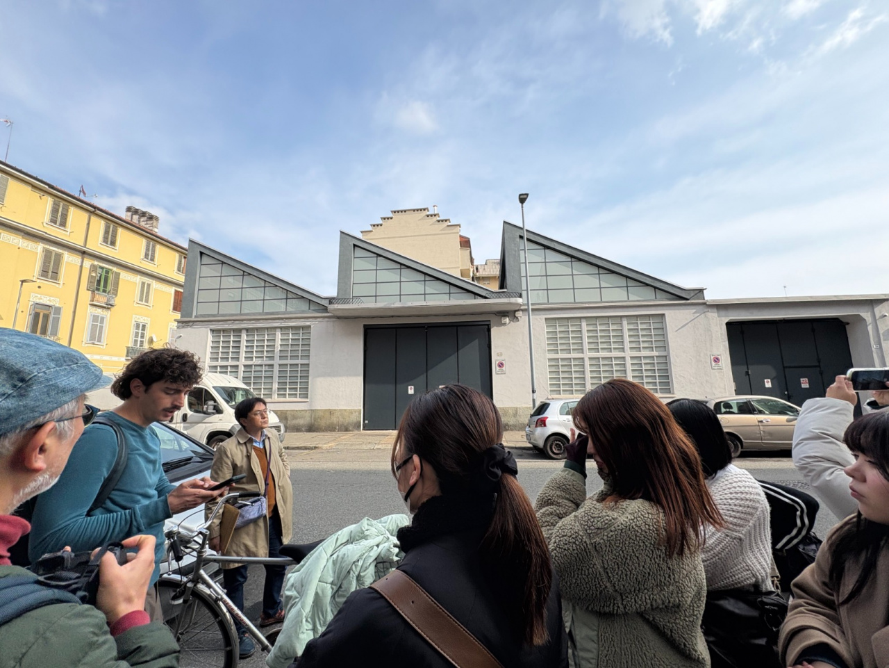 歴史的な工業地区であることもトリノ市北部地域の特徴です。よくよくまちを見ていると、昔ながらのギザギザの屋根をした建物が残っていたり、昔は2,500人を雇用していたタバコ製造の工場跡地が残されていました。老朽化のため中には入れませんでしたが、まちの景観を形成する建物になっています。また、その工場周辺部に住む従業員の住宅も多く立地しています。集合型住宅やモダンな教会、石畳が残りカフェが立地する路地など、この地域での生活感があふれる場所をたくさん紹介していただきました。