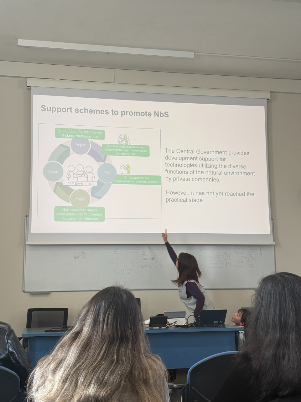 私達の発表を行う前に、まずは服部先生からの挨拶がありました。そこでは、私達が龍谷大学の学生であり、京都から来ていることなどが話されていました。服部先生の話が終わってからは私達がネイチャーベースドリューションのグループ、ソーシャルジャスティスグループ、フードシステムグループの順番で発表しました。