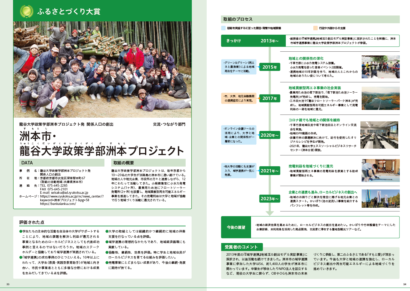 ・「域学連携」の成功事例のひとつといえる。10年以上にわたって、大学生(教員・実践型教育助手)が地域と向き合い、市民や事業者とともに多様な分野における成果を生みだしてきている点を評価。
