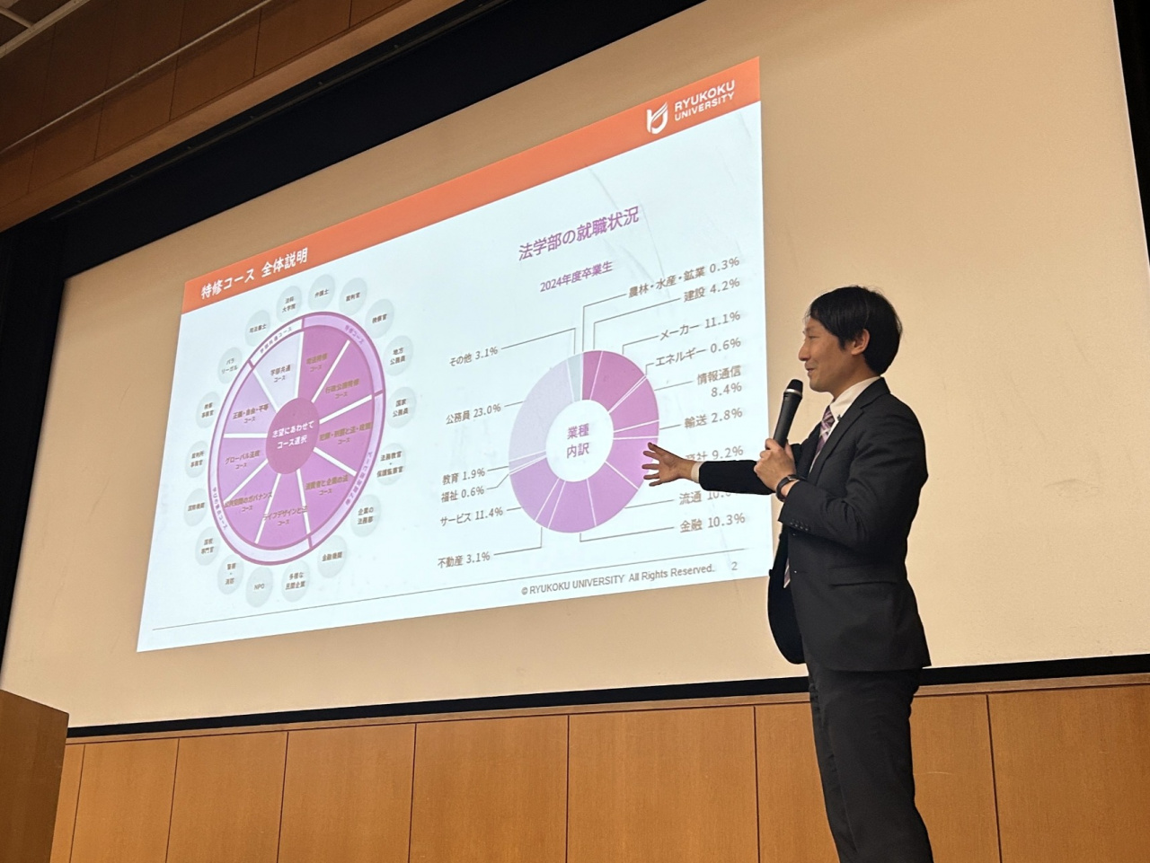法学部では、入学式に先立つ4月1日より、スムーズな大学生活のスタートを支援するためのオリエンテーションを実施いたしました。説明会では、法学部の学びの骨格となるカリキュラムや、自身で時間割を組み立てる履修登録の方法について詳細な解説が行われ、学生たちは真剣な表情で耳を傾けていました。