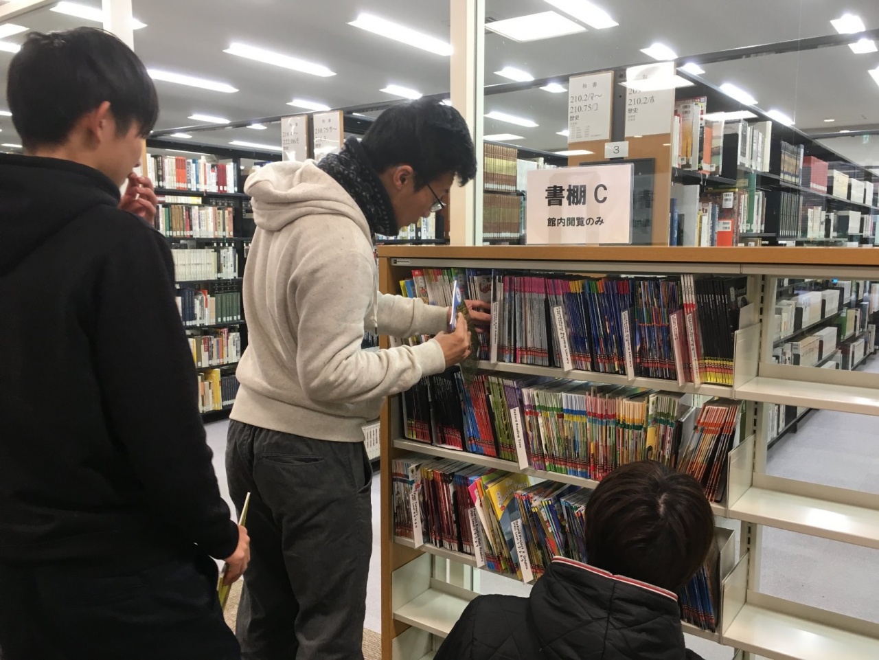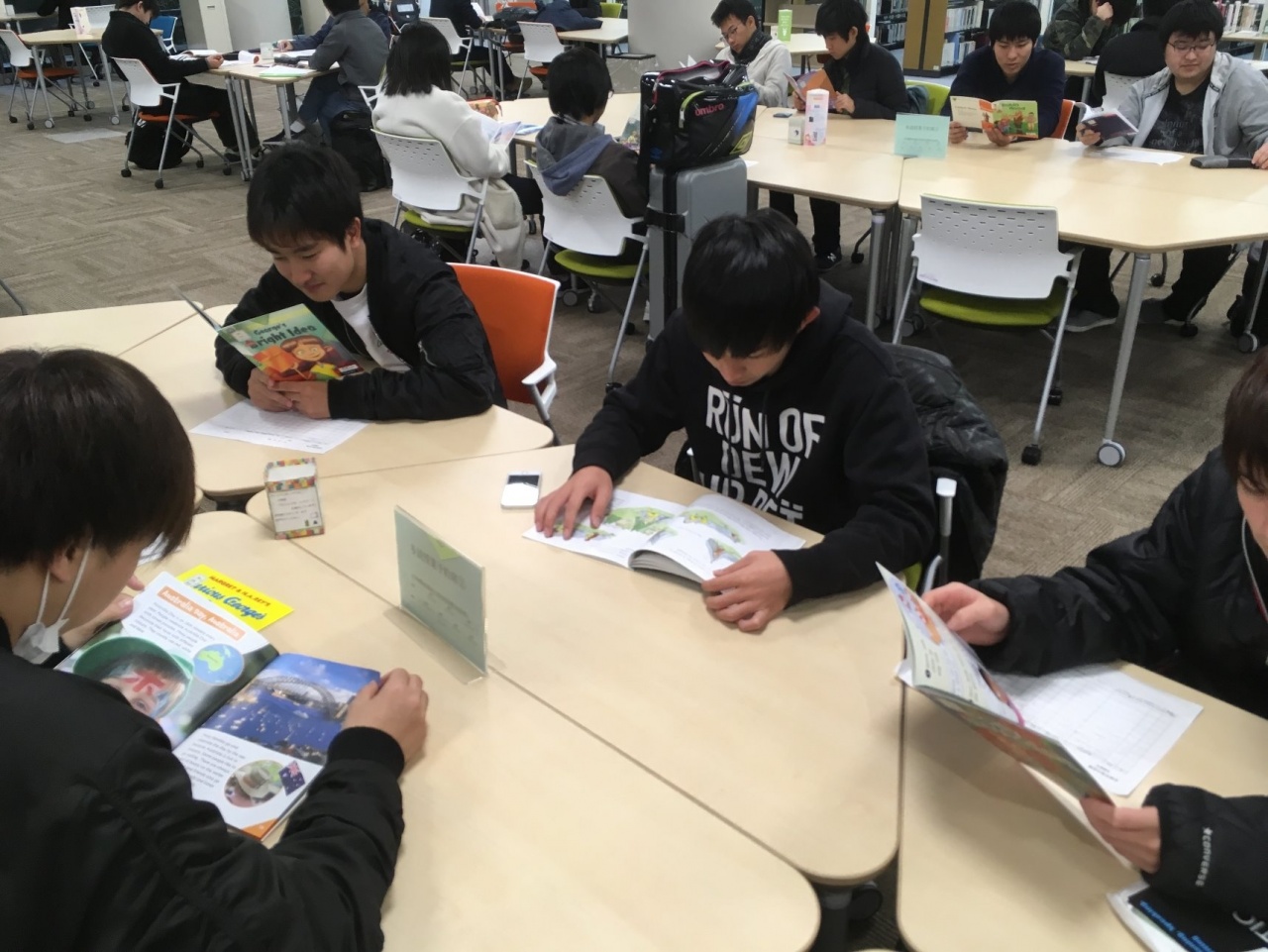 2.1年生の必修英語科目「英語I」および「英語II」の12クラス、約200名の学生が多読学習に取り組みました(授業の20~30分を図書館での多読学習に充て、その間学生は自分のレベルと興味・関心に見合った図書を自主的に選択し、辞書を使わずに、日本語に訳さずに、ひたすら読み進めます)。