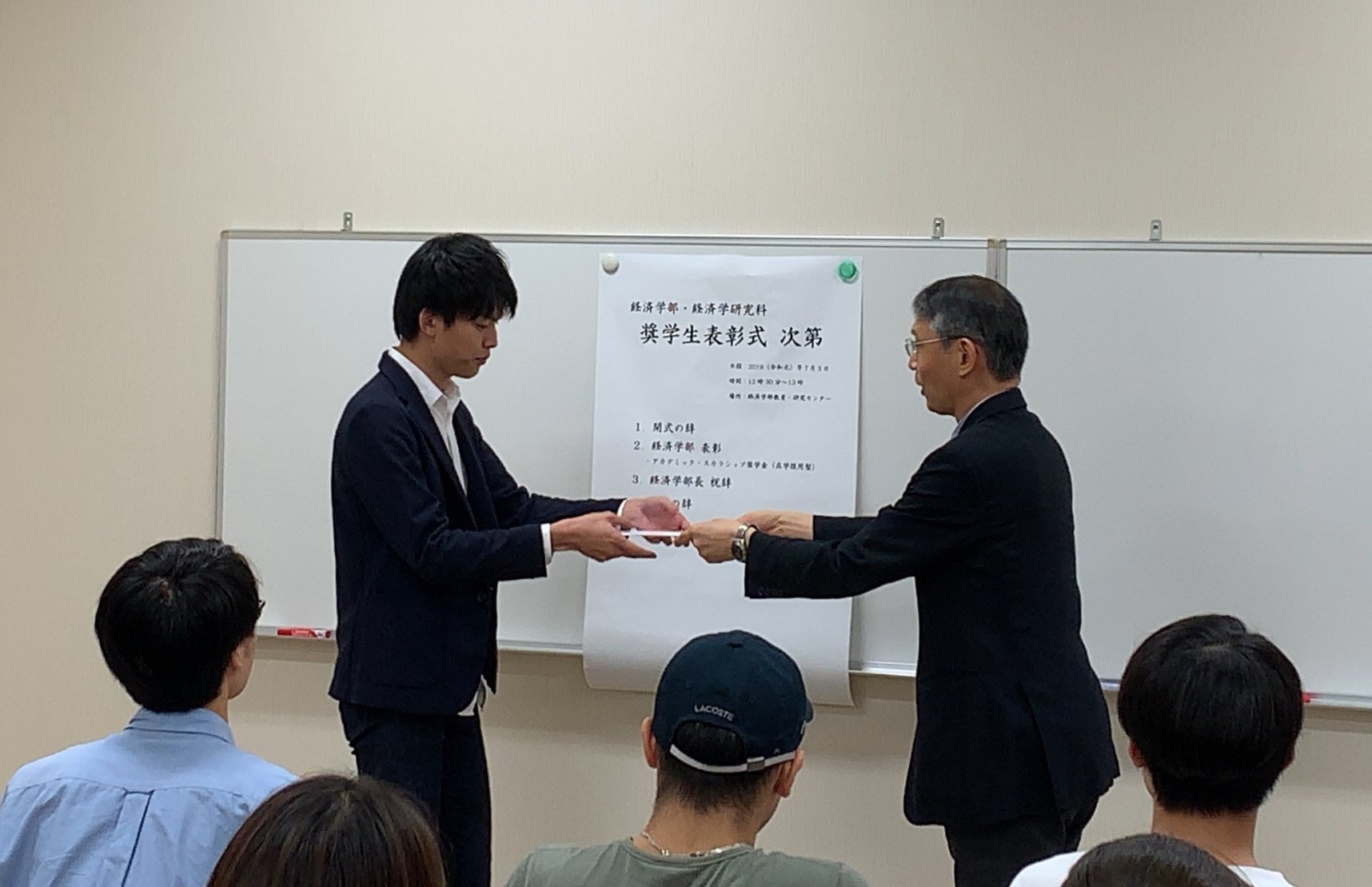 いずれの奨学金も、龍谷大学独自の給付型奨学金であり、特に優秀な成績を修めた学生に対して、給付されるものです。表彰式では、経済学部長と経済学研究科長から、奨学生一人ひとりに表彰状が手渡され、参加した教員からお祝いと期待の言葉が述べられました。