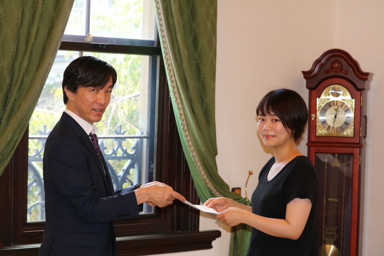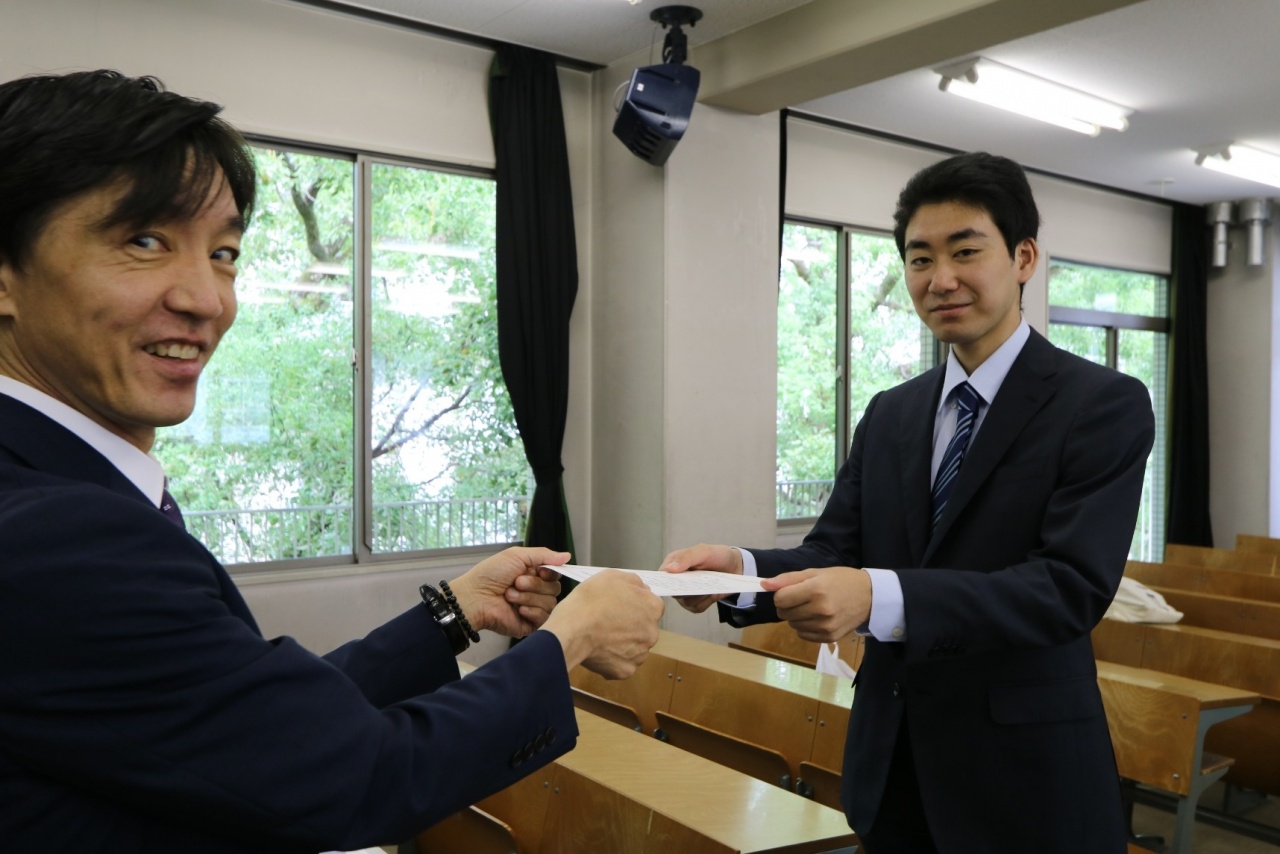 このたび、2019年度奨学金給付対象者が学内推薦入学試験を対象として2名決定したことから予約採用決定通知書が渡されました。