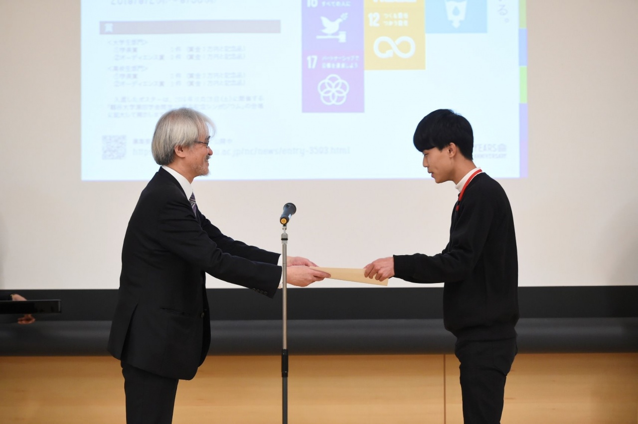 入選作品の中から、学長賞とオーディエンス賞の発表があり、入澤学長から賞状が授与されました。