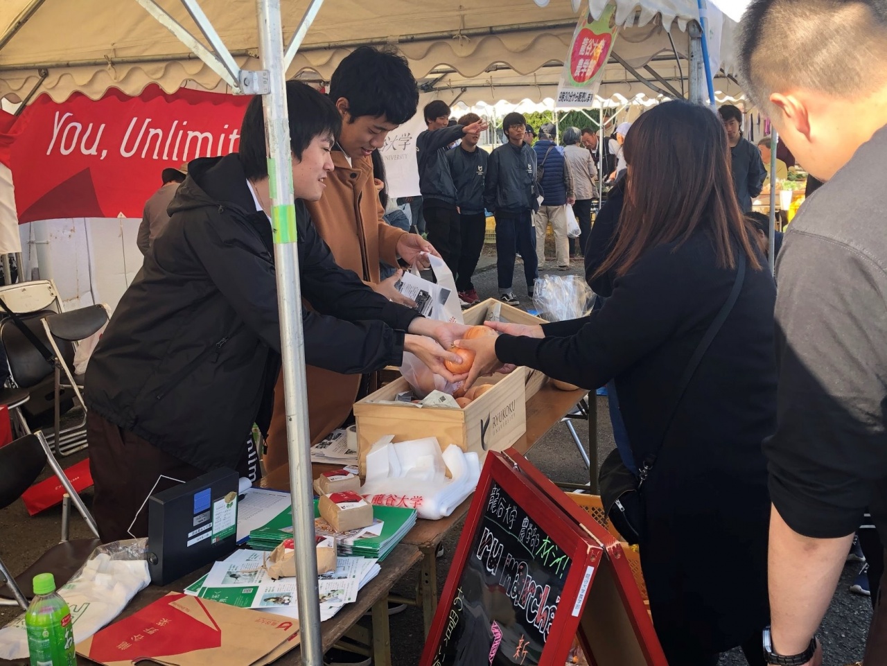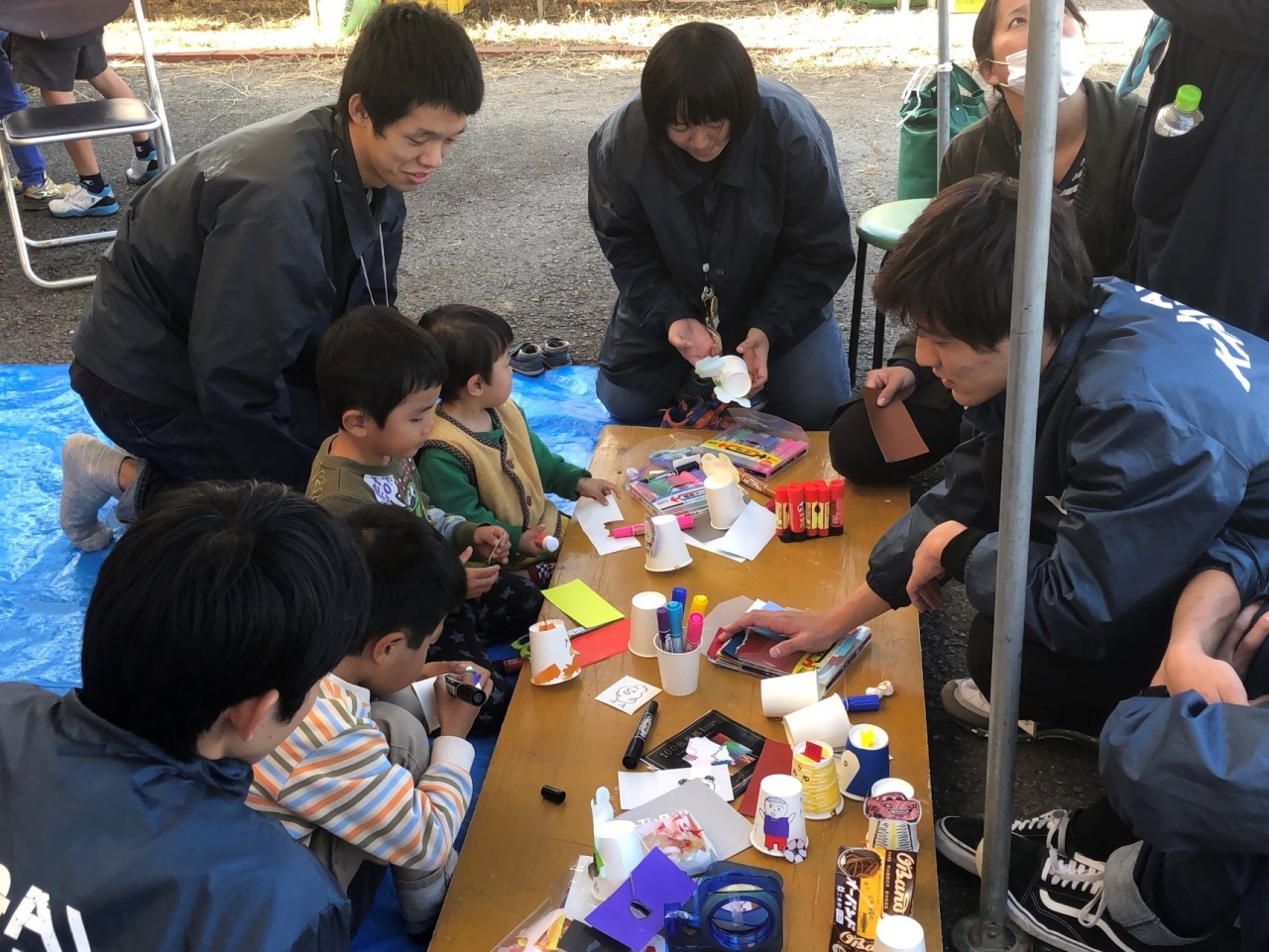 今年度は野外活動部が子どもたちを対象とした工作ブースを出展し、「動く紙コップおもちゃ」を100名を超える子供たちと作った他、農学部から学生広報スタッフが参加し、「食の循環実習」で栽培、収穫した新米や野菜の販売を行い、地元の方々との交流を楽しみました。