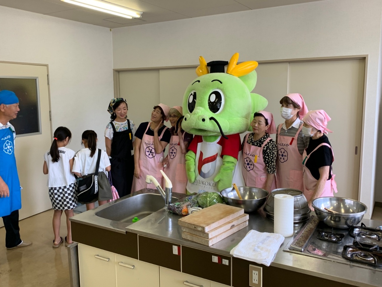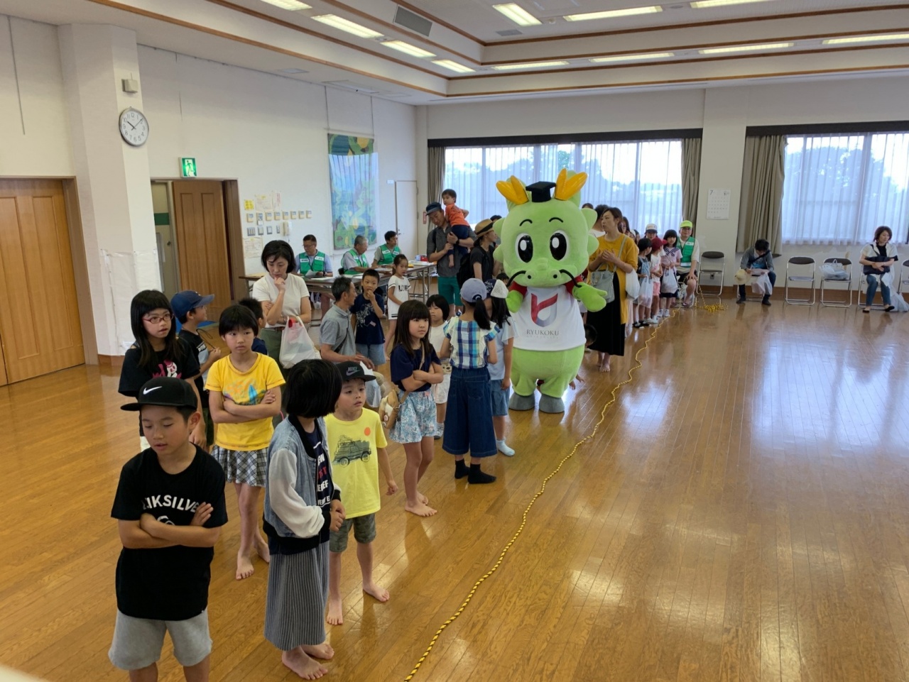 大津市の仰木の里学区で、龍谷大学の学生研究員と、地域の自治連合会、そして大津市役所が連携してまちづくりに取り組んでいる「学生まちづくりLab」の取り組みとして、2019年7月15日(月)に開催された、大津市仰木の里の地域イベントである「仰木の里子どもフェスタ」に、学生が龍谷大学マスコットキャラクターの“ロン君“とともに、防災に係るクイズの司会進行を行うなどイベントを盛り上げました。