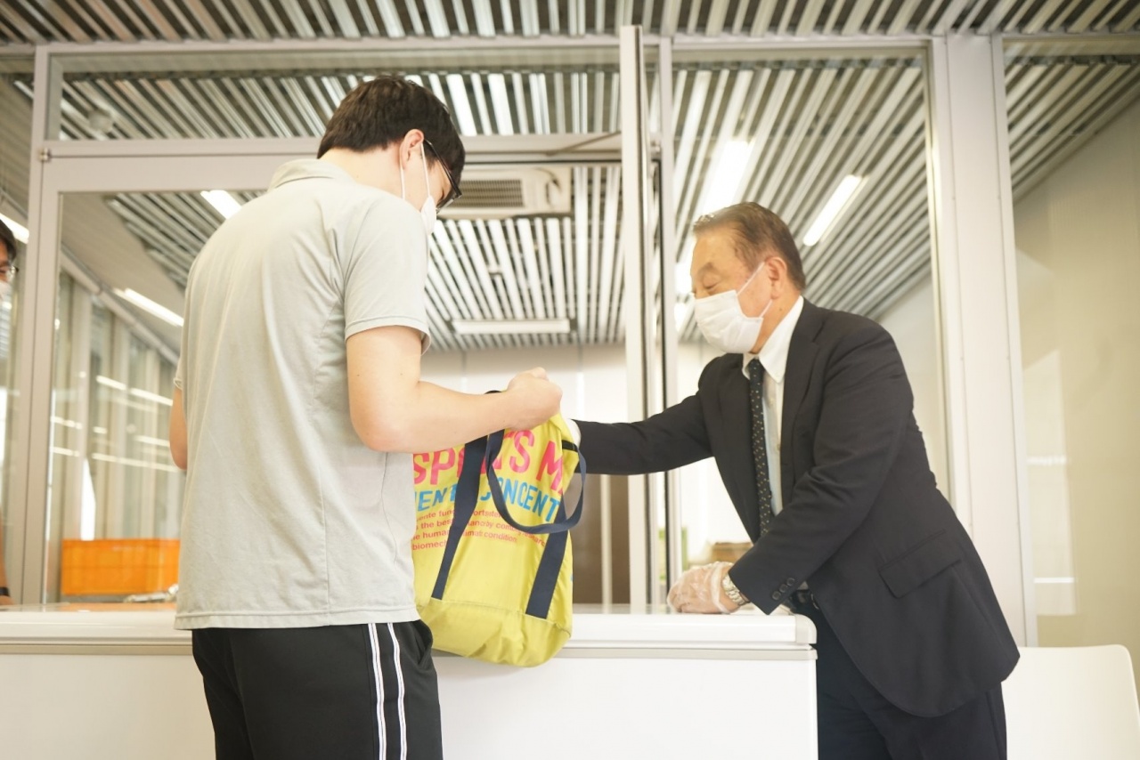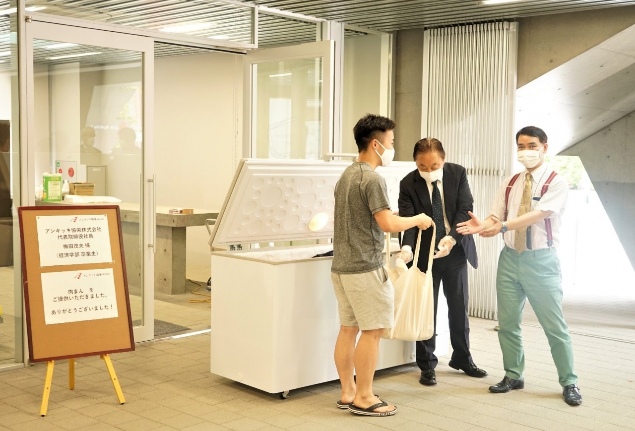 この度、この取り組み趣旨にご賛同いただいた、アンキッキ協栄株式会社が、冷凍肉まん200食分800個を本学に寄付いただき、食材と共に学生達に配布しました。冷凍肉まんの提供のみならず、学生達への配布をアンキッキ協栄株式会社梅田茂夫社長(本学経済学部卒業生)自らご協力いただきました。